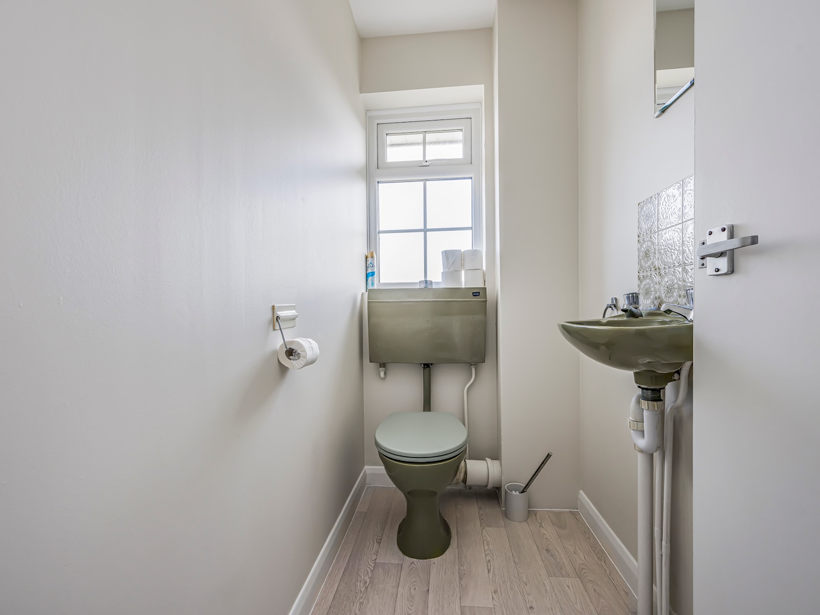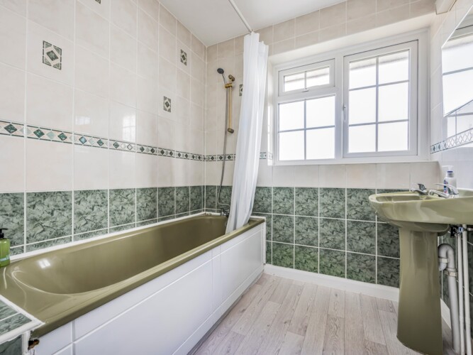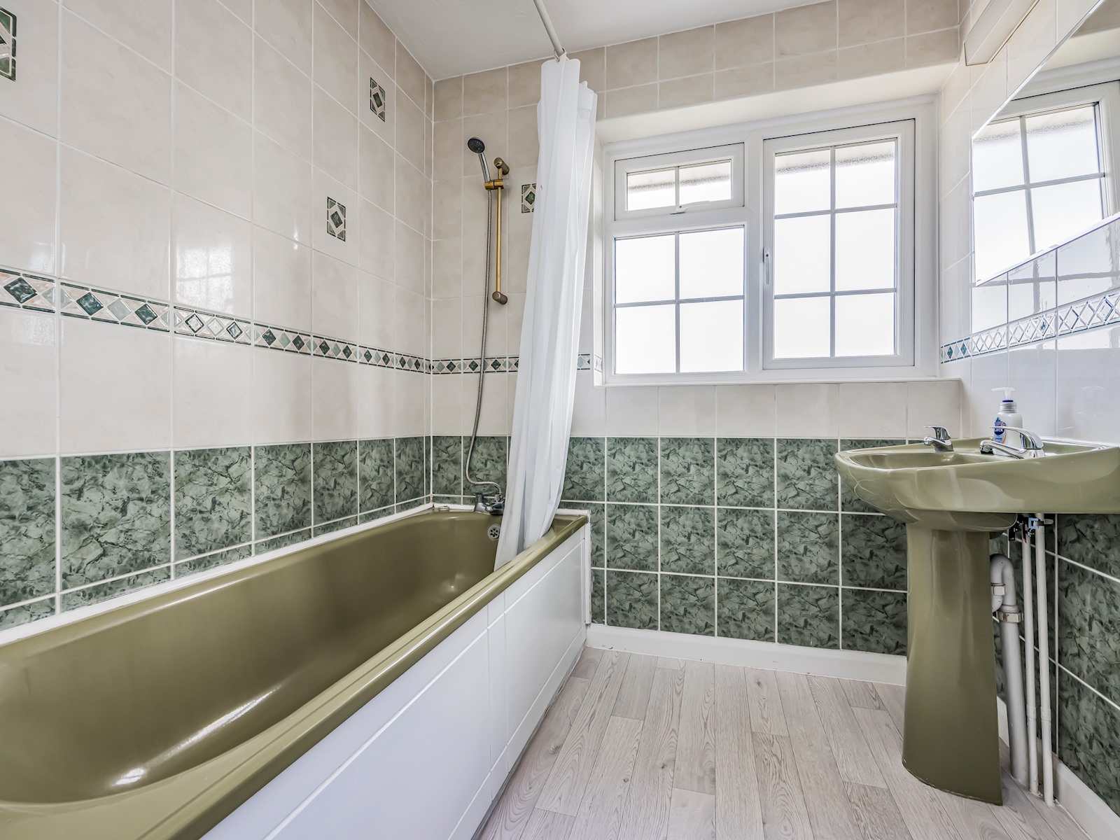 Bathroom 1: Shower over Bath, with a separate WC & Basin next door / First Floor