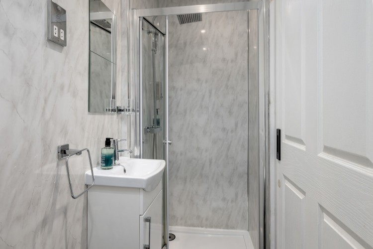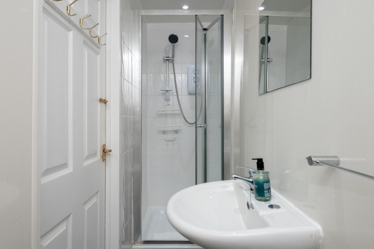 Bathroom: Walk-in shower, WC & basin + fresh towels & toiletries