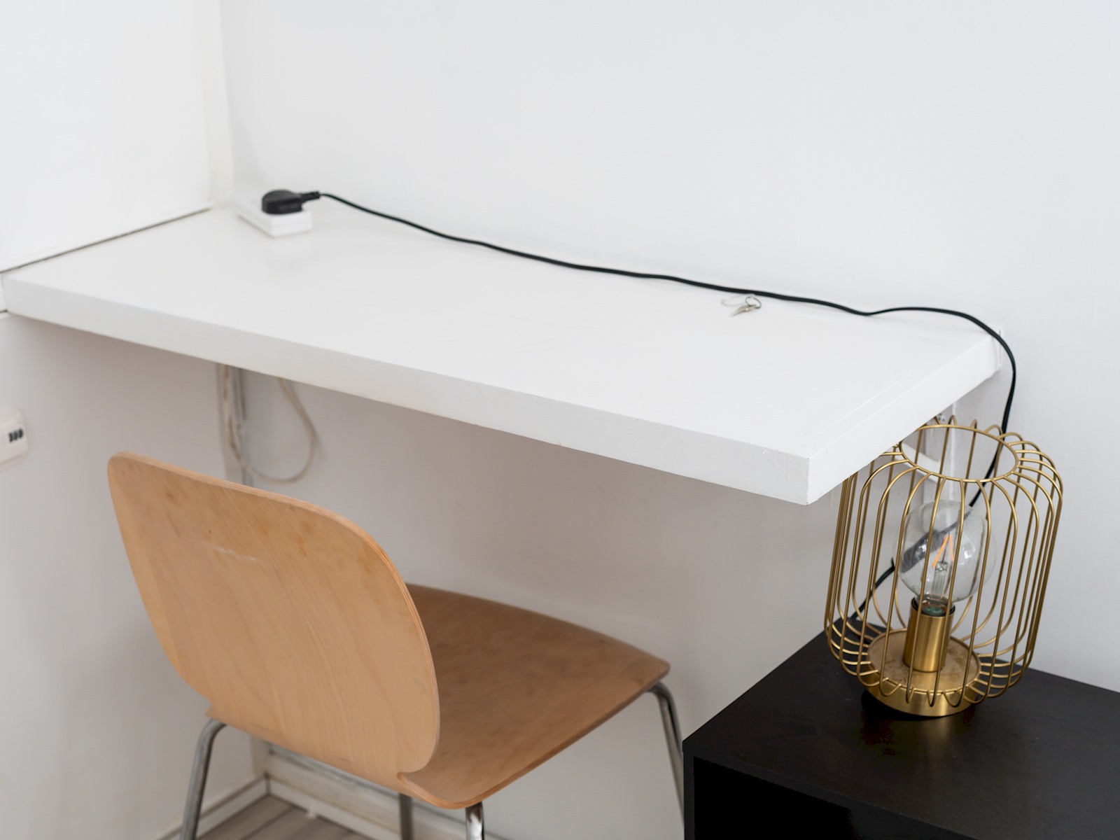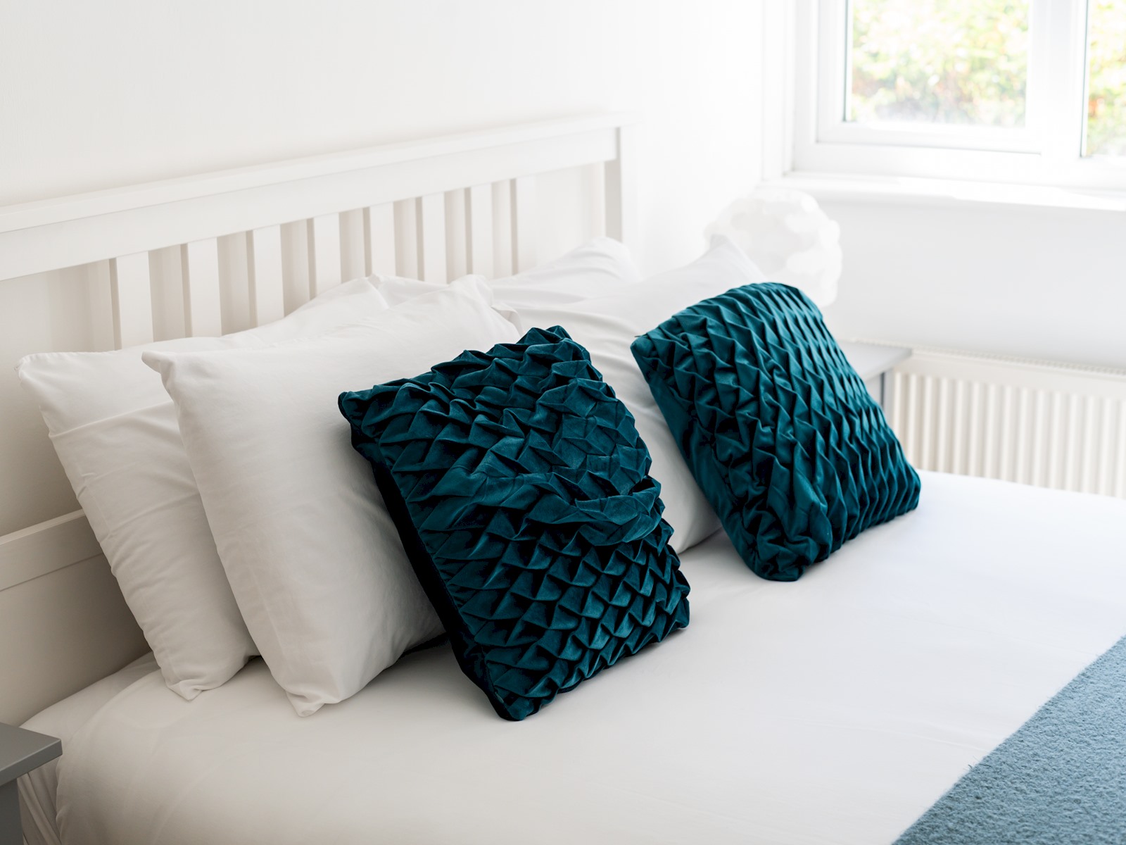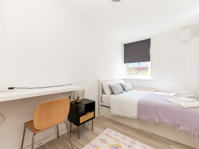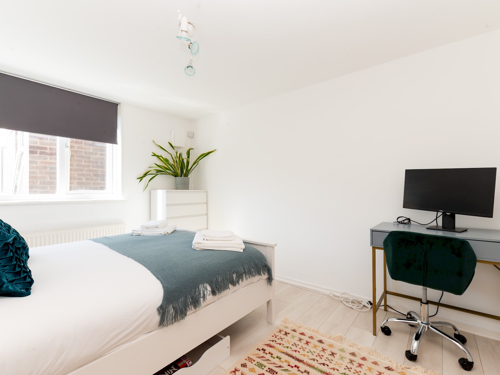 Large double bedroom with soft and comfy bedsheets and additional pillows. There is an additional workspace.