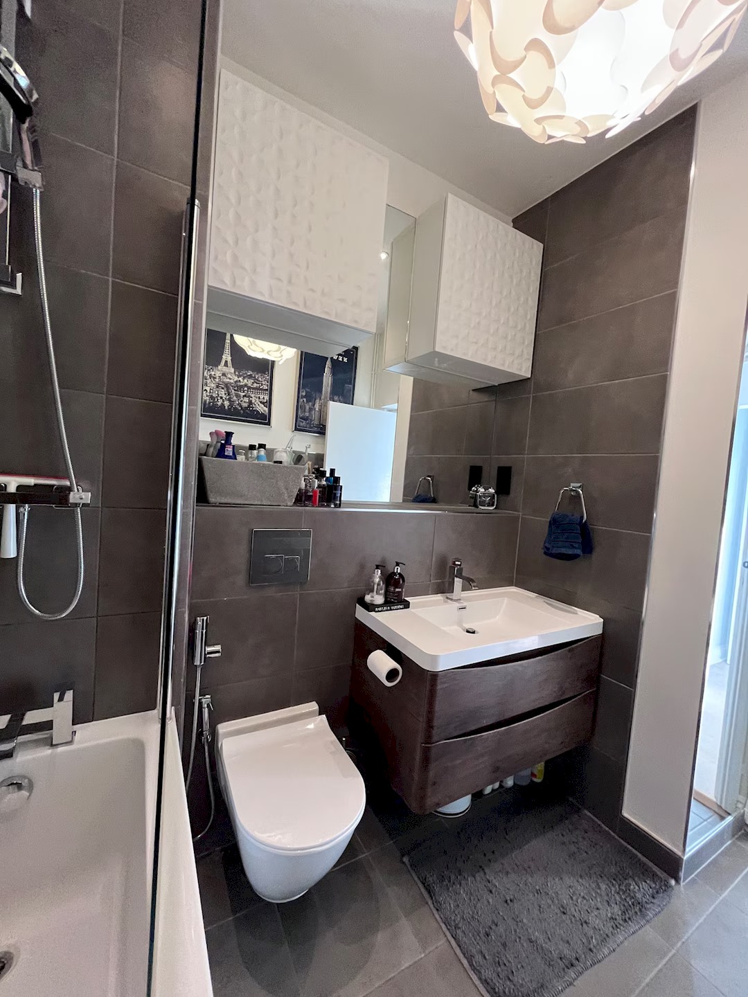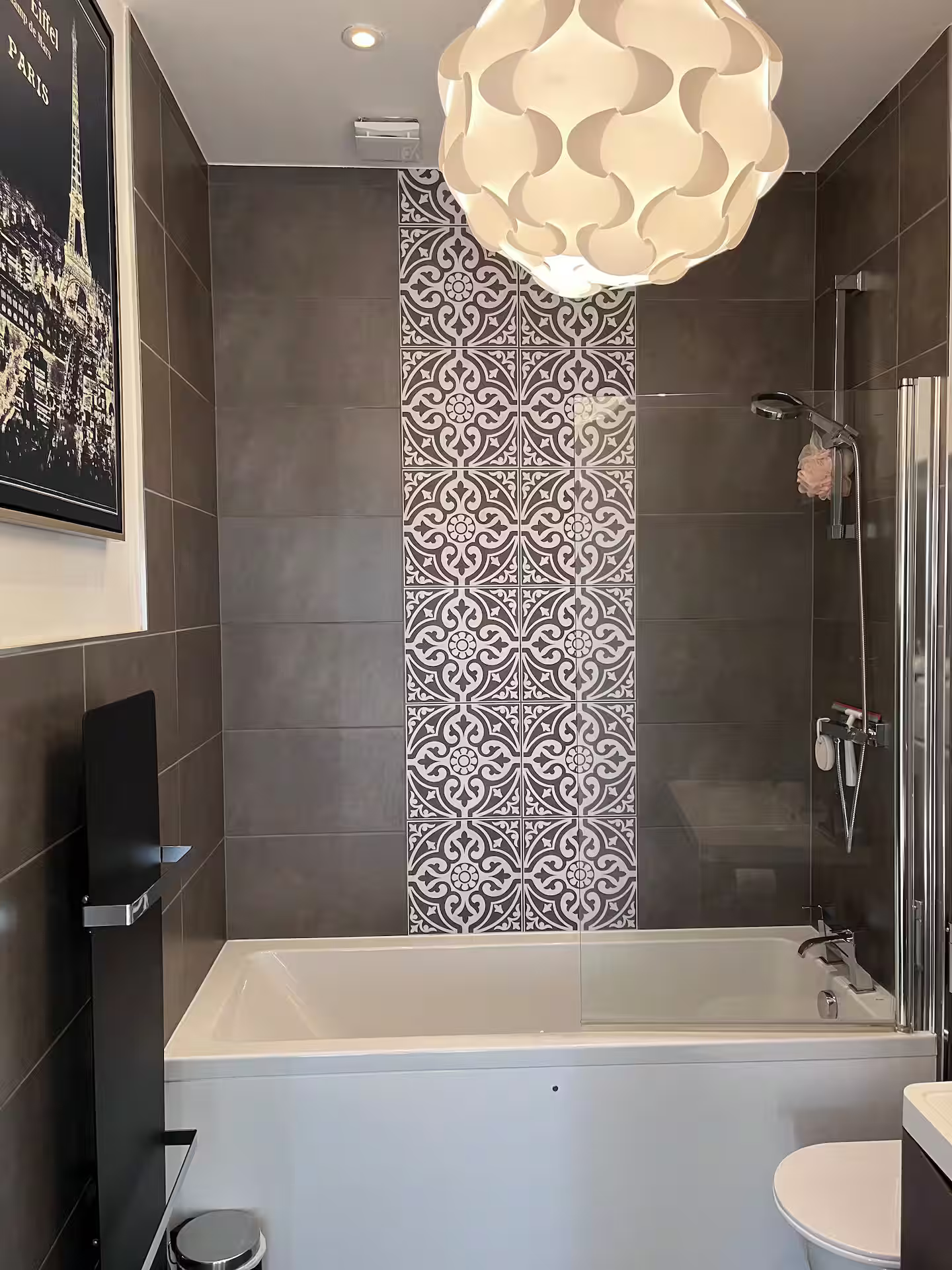 A full bathroom with a bathtub and shower completes the space, giving you everything you need for a comfortable stay.