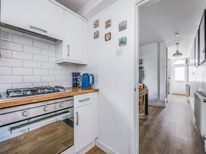 At the end of the corridor, you’ll find the fully equipped kitchen, complete with a fridge-freezer, gas cooker, oven, kettle, microwave, and toaster—everything you need to prepare meals with ease. For your convenience, there’s also a washer-dryer available for use.