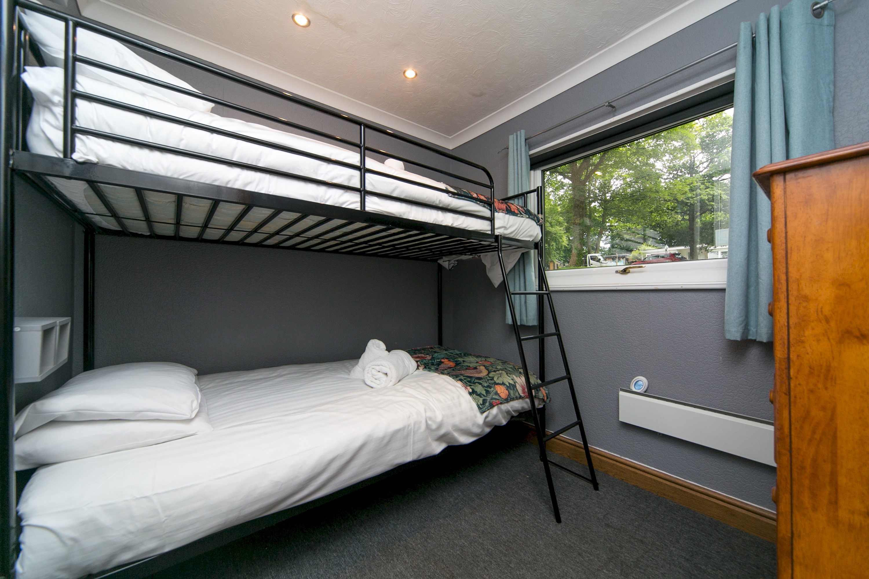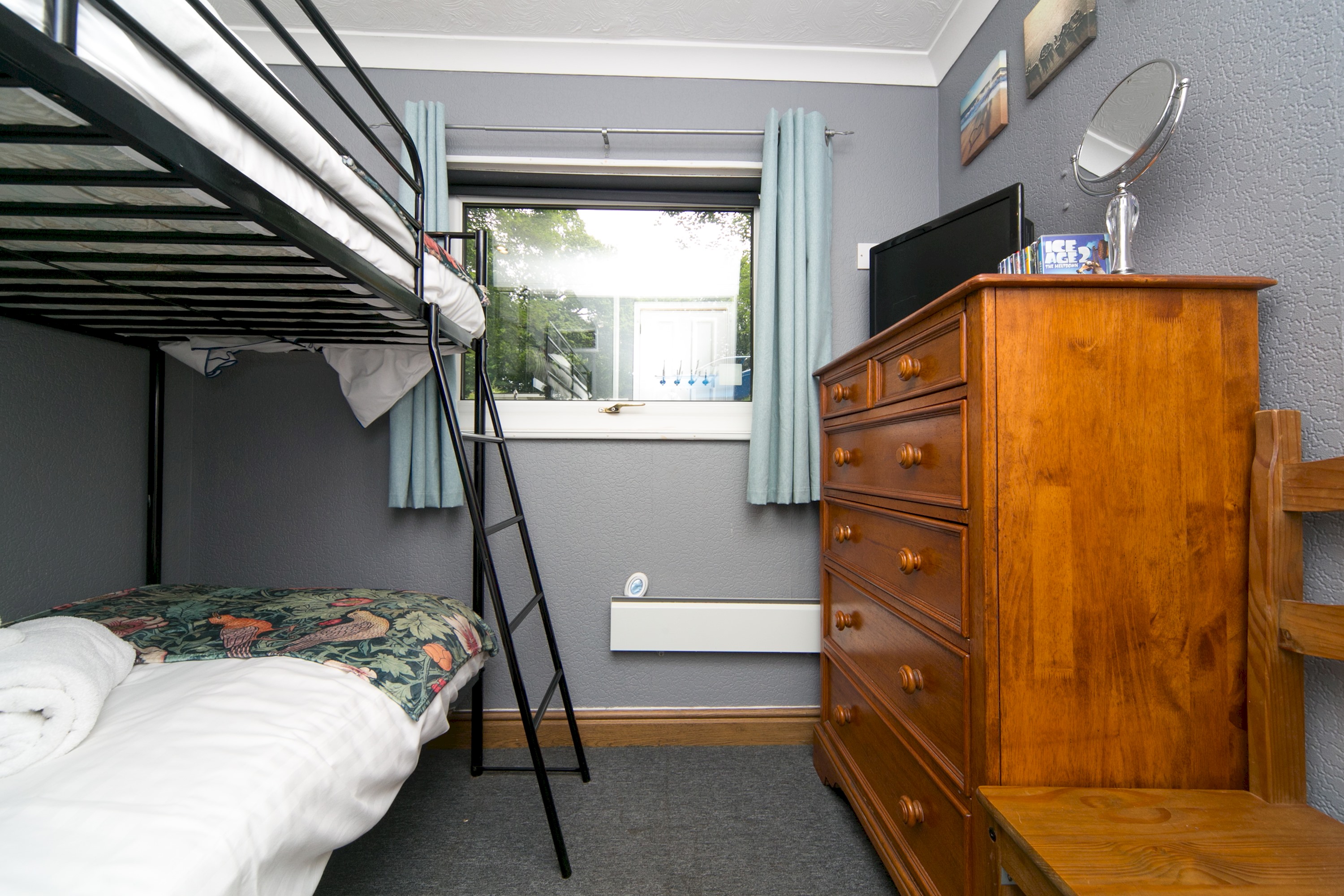 The property has two bedrooms, both equipped with plenty of storage. One bedroom features a double bed and wardrobe, and the other has a bunk bed and drawers. A shower room is conveniently located just off the bedrooms.