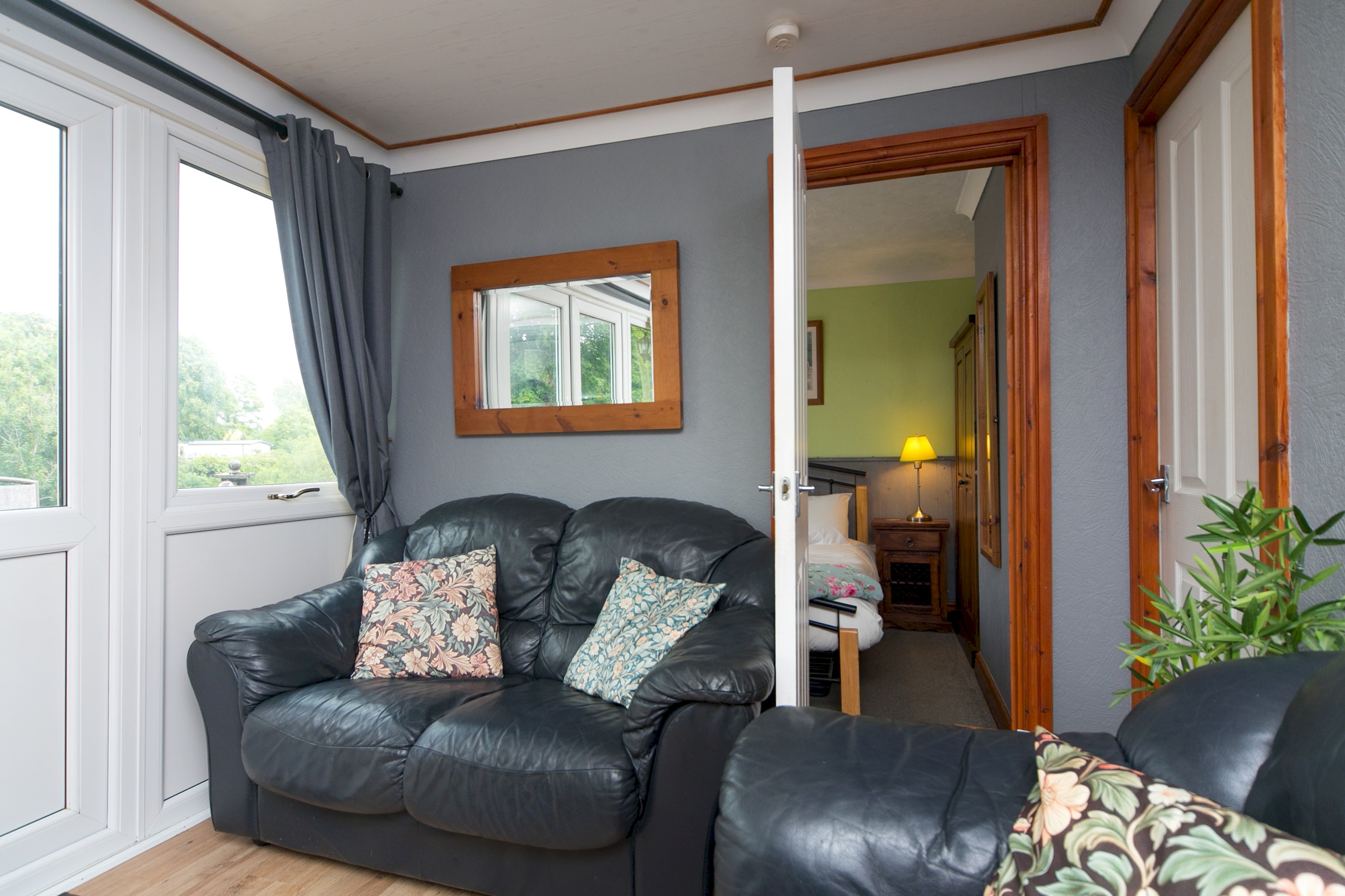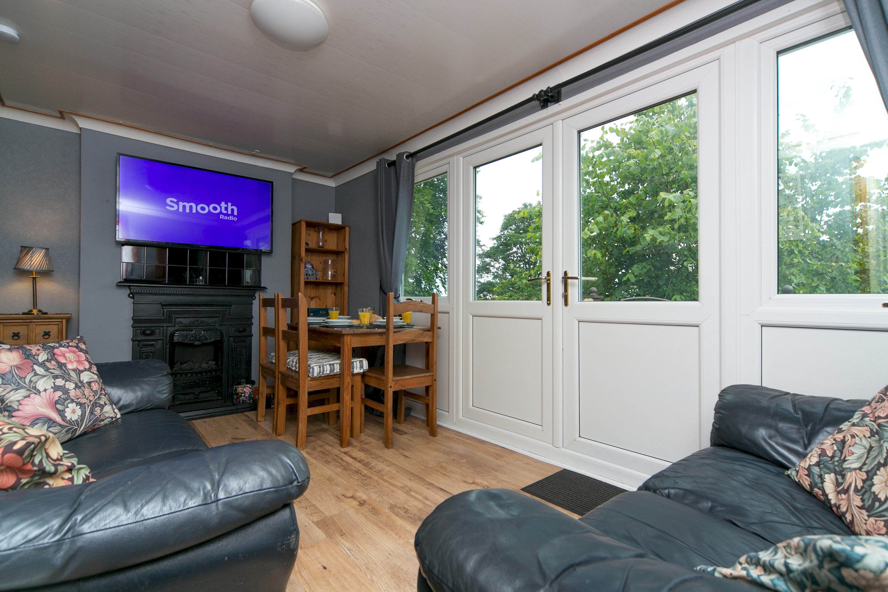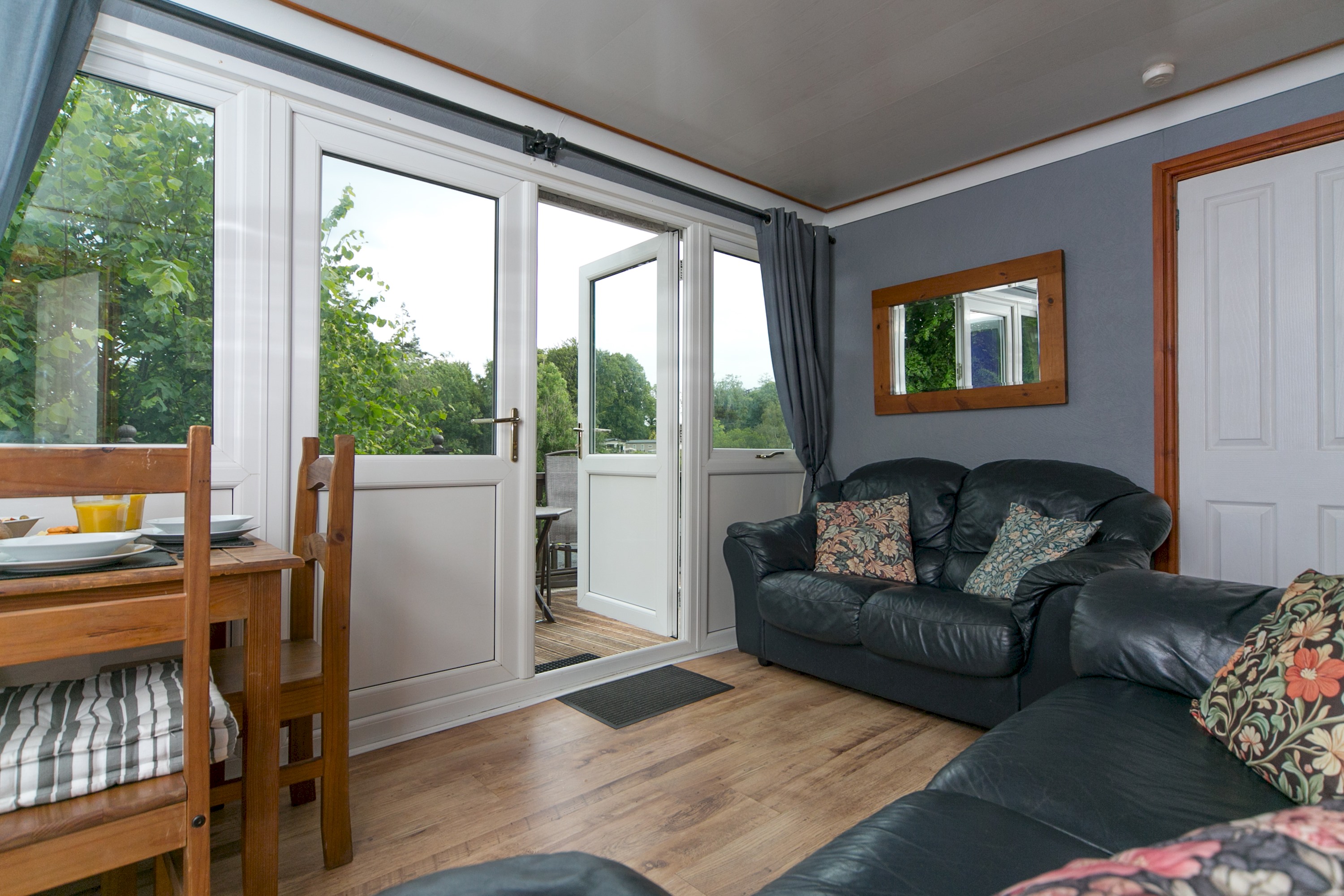 Inside, the cosy chalet features a well-equipped kitchen area with everything you need to prepare meals throughout your stay. The adjacent lounge provides comfortable seating with a three-seater and a two-seater sofa.
