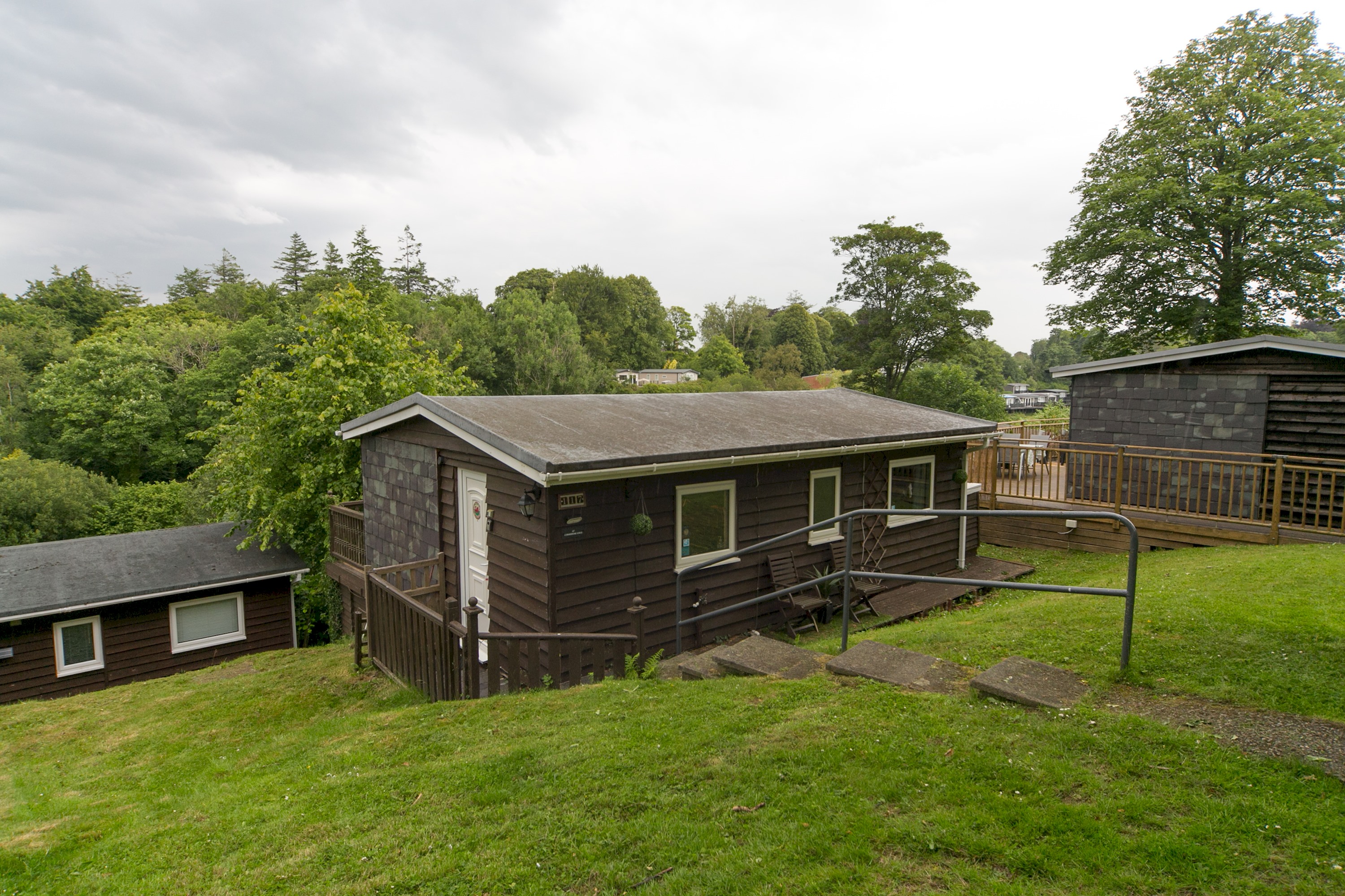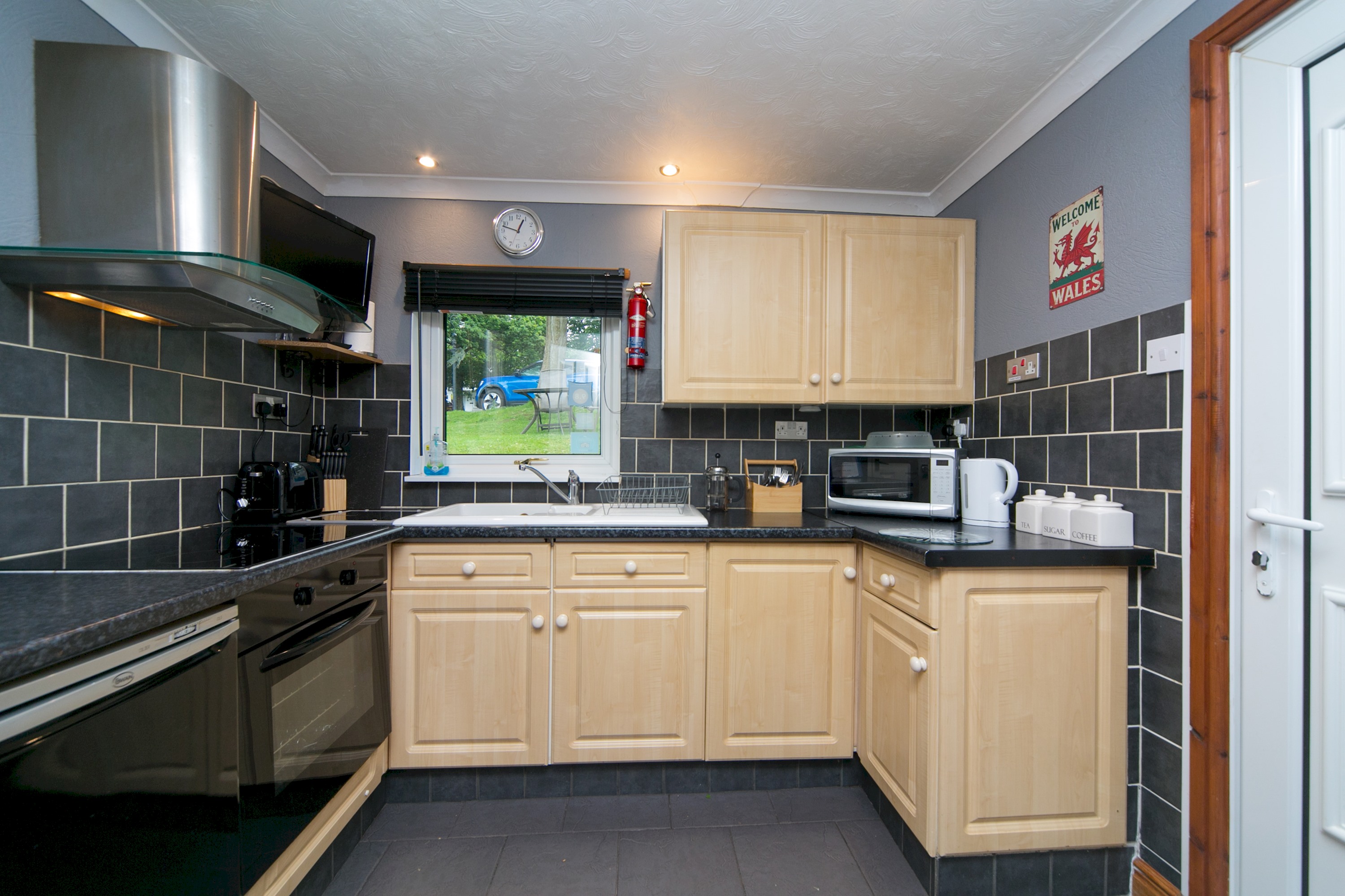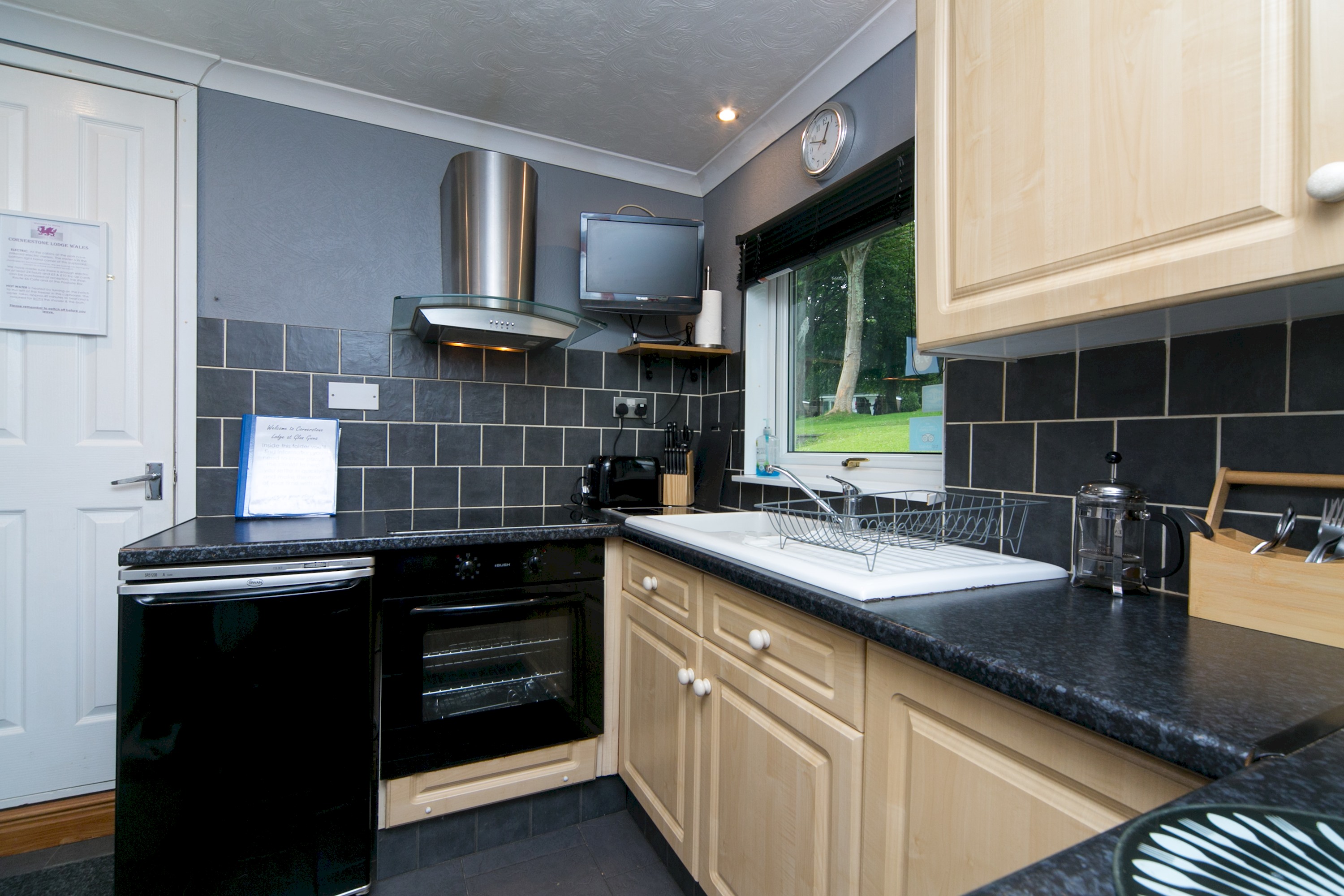 Inside, the cosy chalet features a well-equipped kitchen area with everything you need to prepare meals throughout your stay. The adjacent lounge provides comfortable seating with a three-seater and a two-seater sofa.