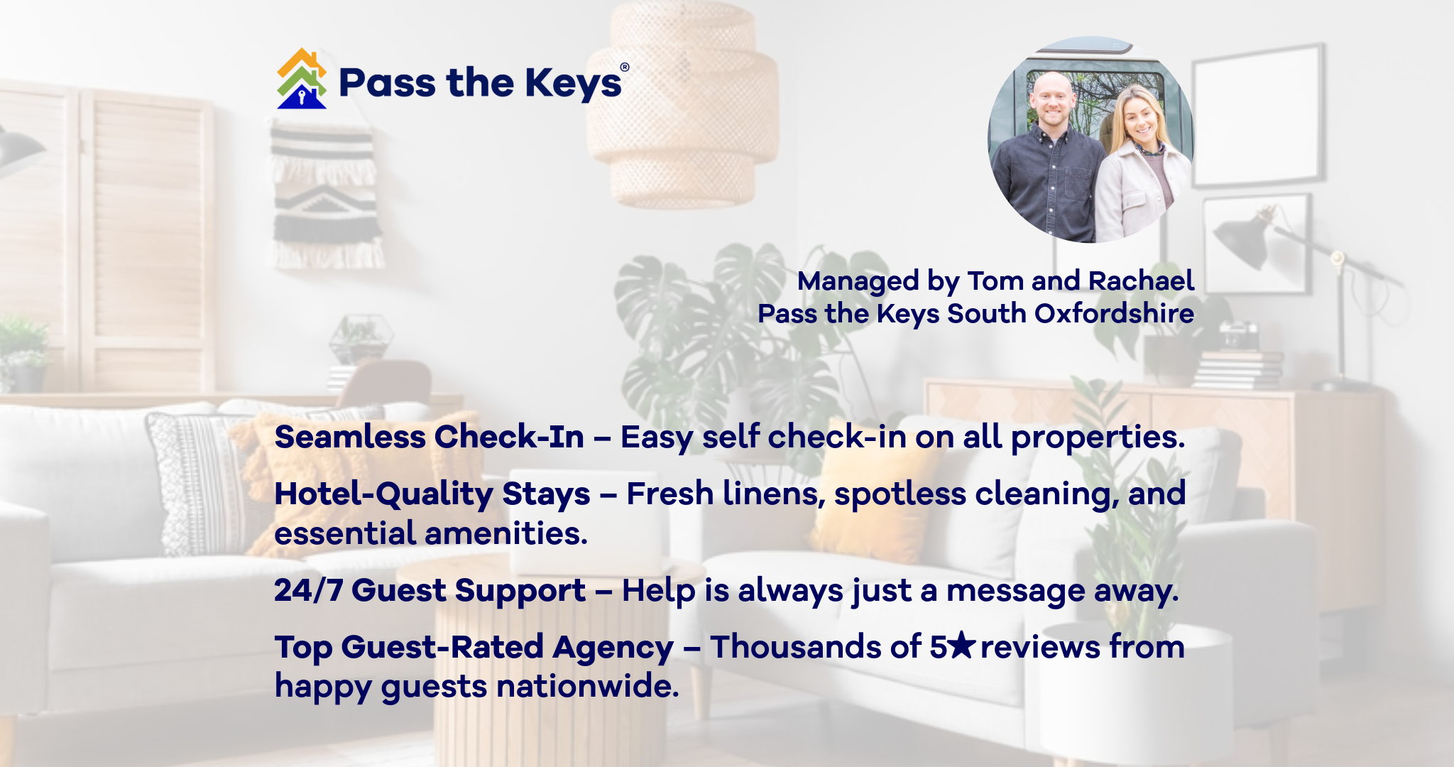 Hi, I’m Tom and have lived in South Oxfordshire for most of my life. 4 years ago I decided to make Henley-on-Thames my home, which is where I now live with my fiance Rachael, who I’m pleased to say joins me on this Pass the Keys journey. We love the area in which we live and certainly don’t take it for granted. You’ll often find us paddle boarding down the Thames, or exploring the local countryside, accompanied by our two dogs (Reggie & Simba!). I have spent most of my working life in high-end residential property development. Rachael’s background is in marketing and client relations. With our combined experience, a passion for beautiful homes and the area in which we live, we are set and very excited to provide an exceptional service to property hosts and guests alike, in the wonderful South Oxfordshire.