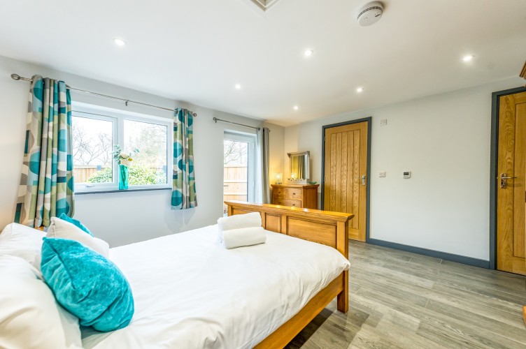 The inviting king-size bedroom is beautifully presented with soft furnishings and leads to a stylish en-suite shower room, featuring a spacious walk-in shower and heated towel rail.