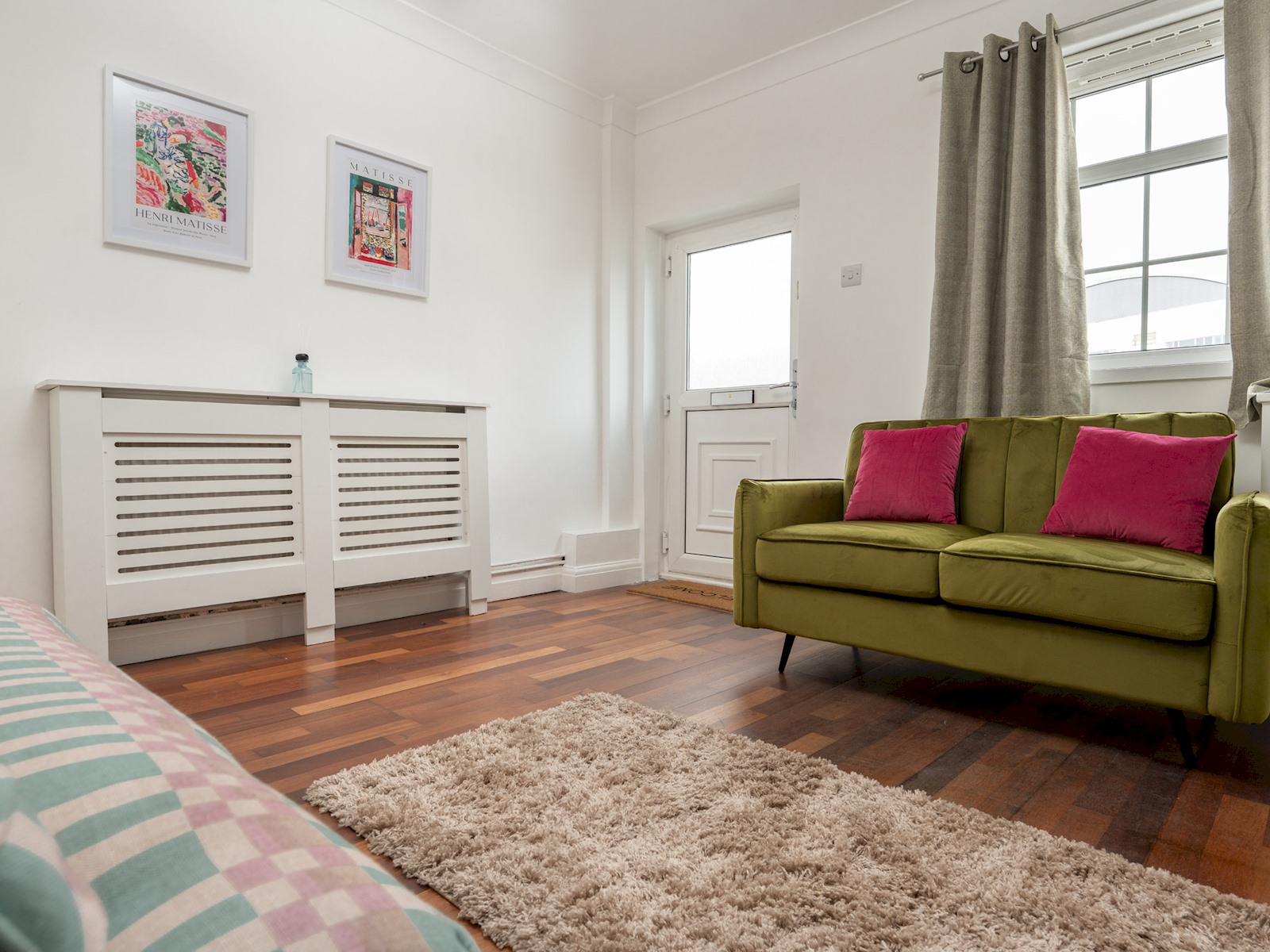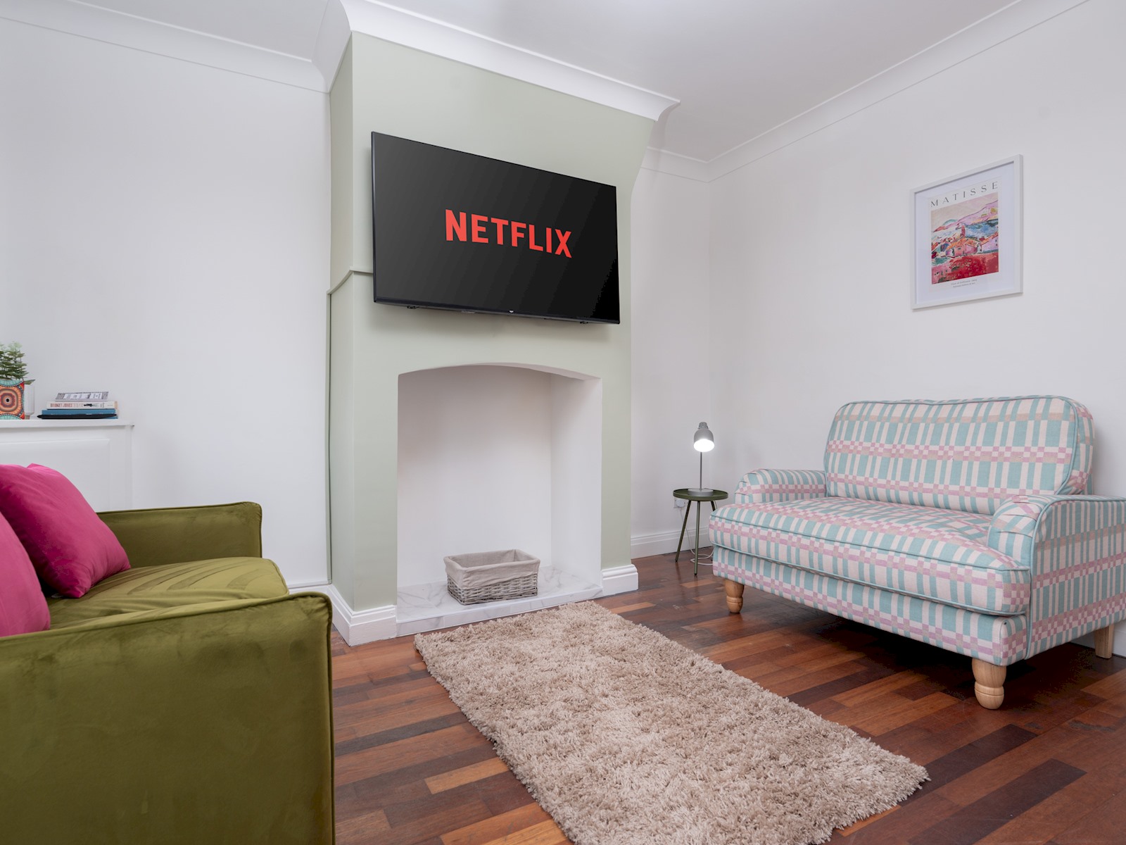 It features a cosy living room with smart TV, a fully equipped kitchen, a modern bathroom, and a private rear garden.