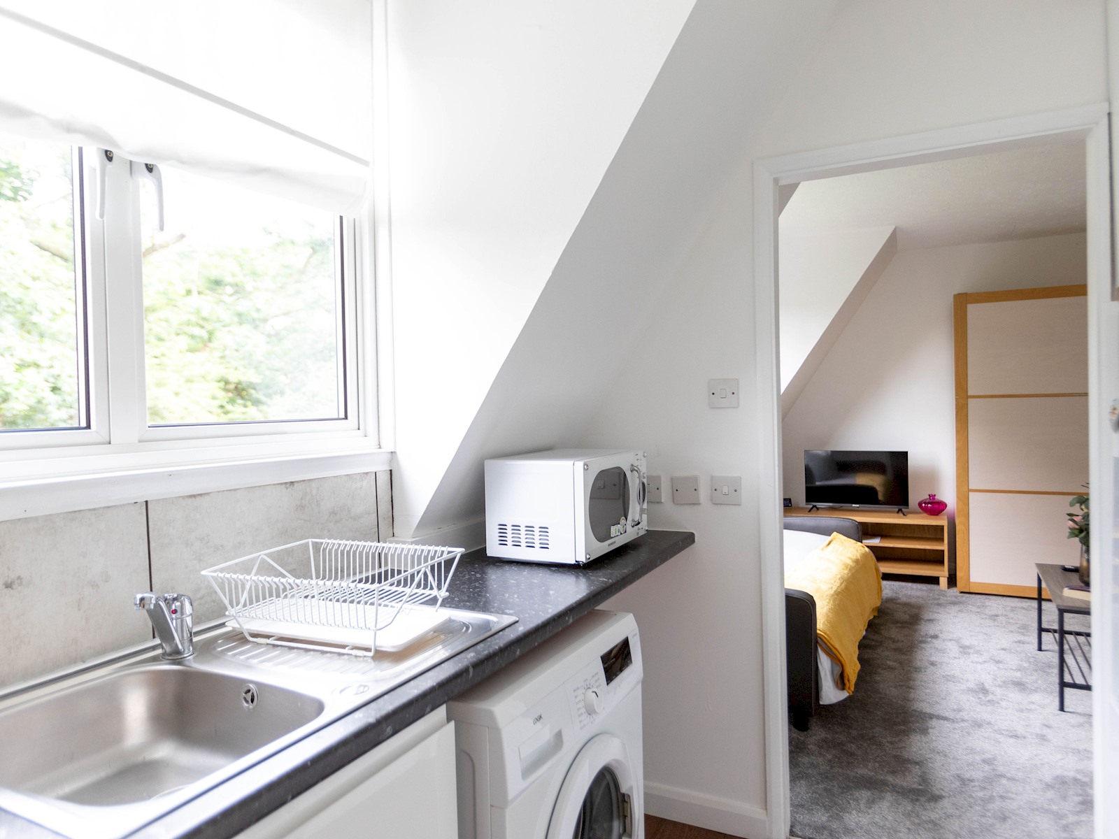 The main living area features a comfortable sofa that easily converts into a plush double bed, providing a restful night’s sleep for two. After a day of sightseeing or work, unwind on the sofa and enjoy your favourite shows on the flat-screen TV.