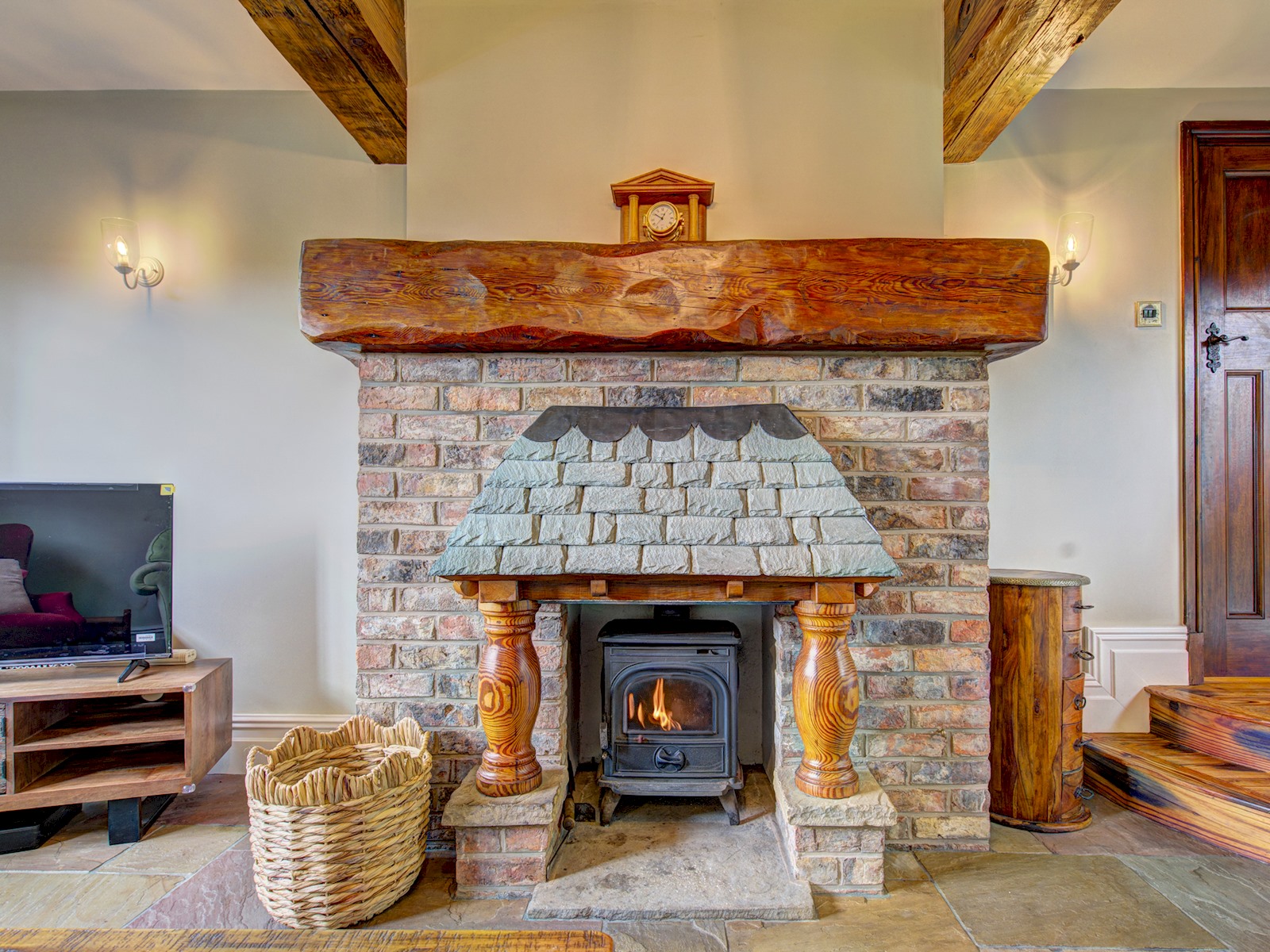 Back lounge with log fire, underfloor heating, and Smart TV