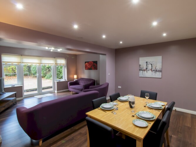 Dining Area: A large table that seats six, ideal for meals or board games.