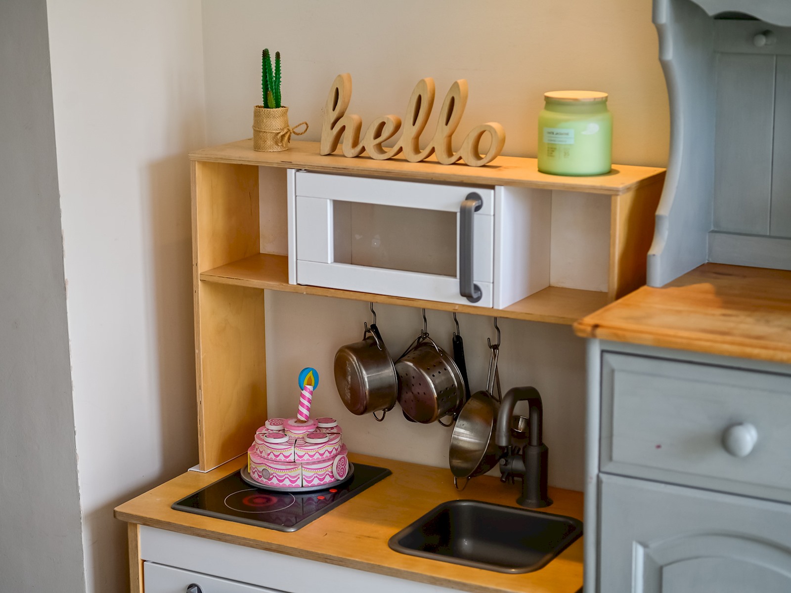 The kitchen is fully stocked with everything you need for a longer stay or weekend getaway, including a fridge, oven, microwave, coffee machine, cookware, and utensils.