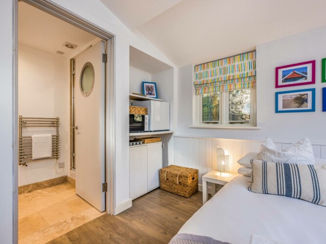 Walk down the covered walkway towards the welcoming sky blue door with porthole and enter into the delightful studio space. The comfortable king bed is made up with fresh white linen and lots of throw cushions. The lovely chair in the large window offers a great spot for curling up with a book and a warming cup of tea after a busy day exploring, or just to watch one of your favourite shows on the TV (you will need to use your own login details to access the apps on the TV). There is a small table and chair set where you can enjoy your breakfast or dinner. The small kitchenette area offers a fridge with a freezer compartment, allowing you to enjoy some of the home made ready meals on offer in the local farmshops. Please note that the kitchenette space is only very small, however the lodge is located in the village of West Ashling with a lovely pub, the Richmond Arms, just a short walk away. There are many other lovely pubs and eateries all within a mile or so of the lodge as well. The small table offers a space for remote working also.