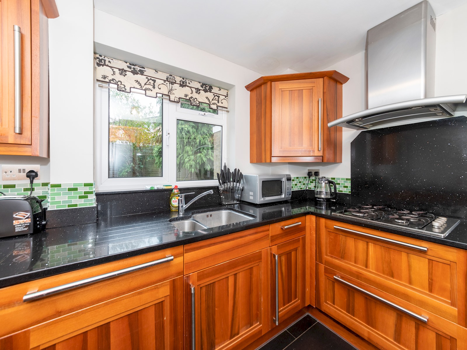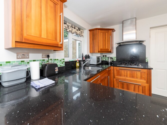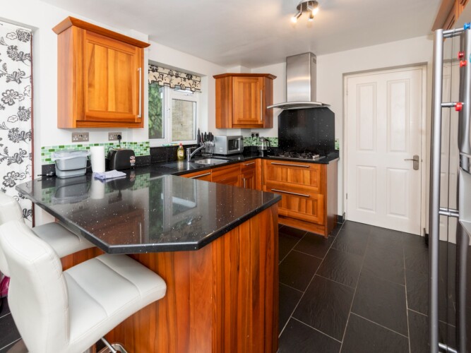 The kitchen is equipped with everything you need during your stay, including cutlery, pots, pans, microwave, oven, hobs, fridge and freezer, and dishwasher.