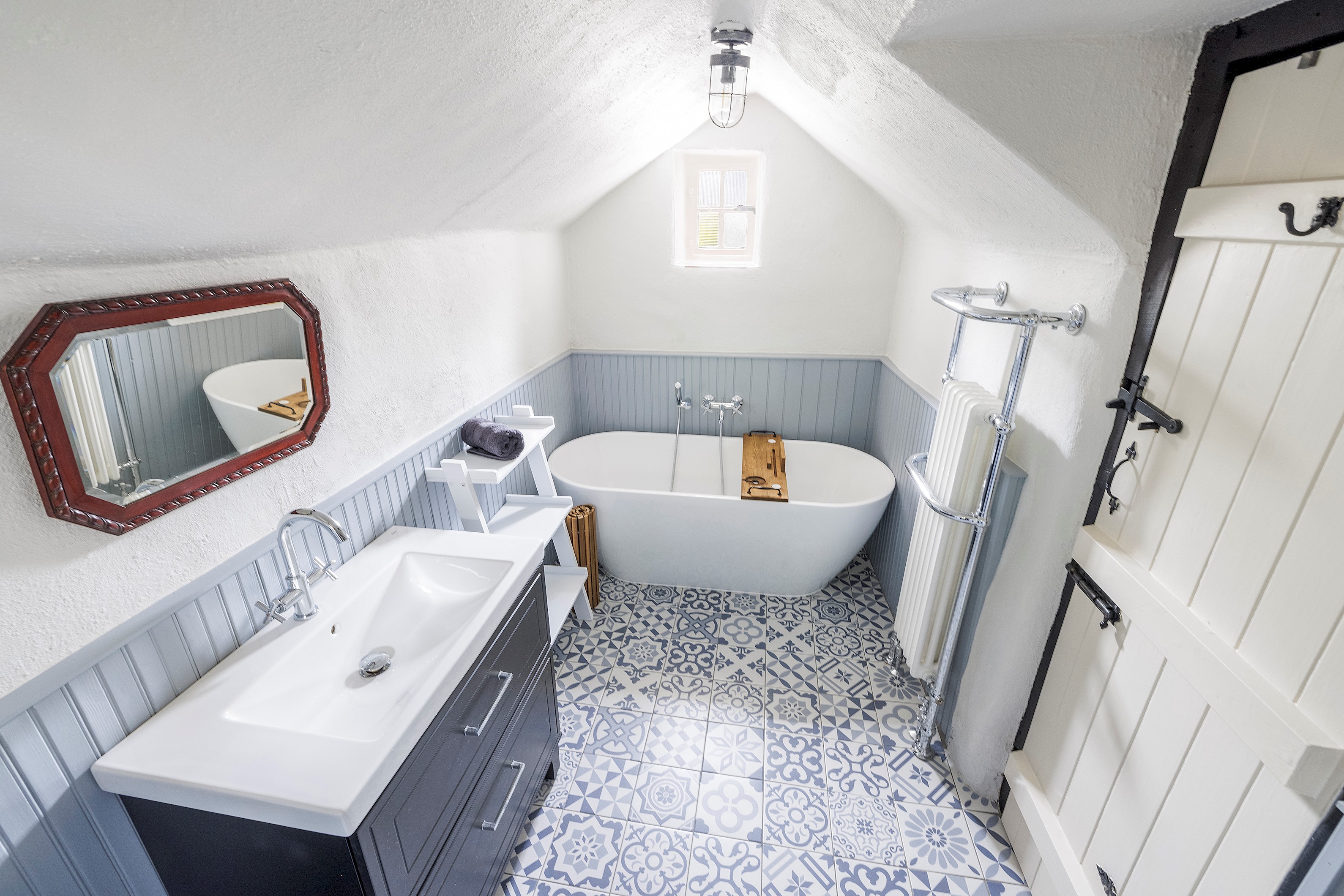 Moving to the upper floor via an open staircase, there is a family bathroom with egg shaped bath and 3 bedrooms.