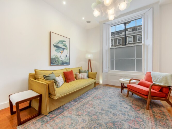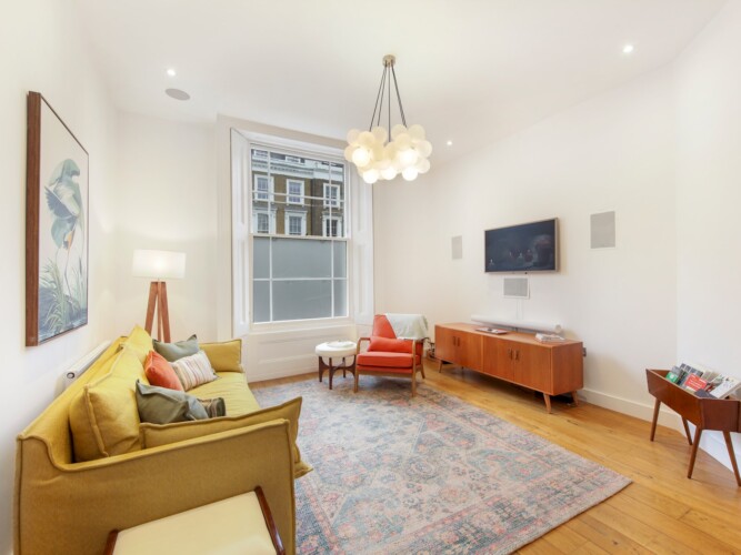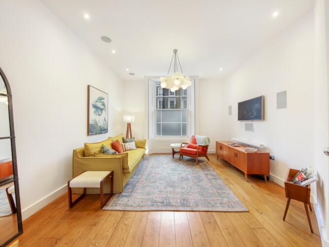 Three well-appointed bedrooms with cozy beds and quality linens, a light-filles living room with ample seating, ideal for relaxing after a day in London.