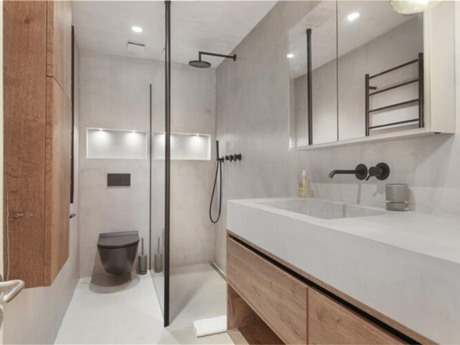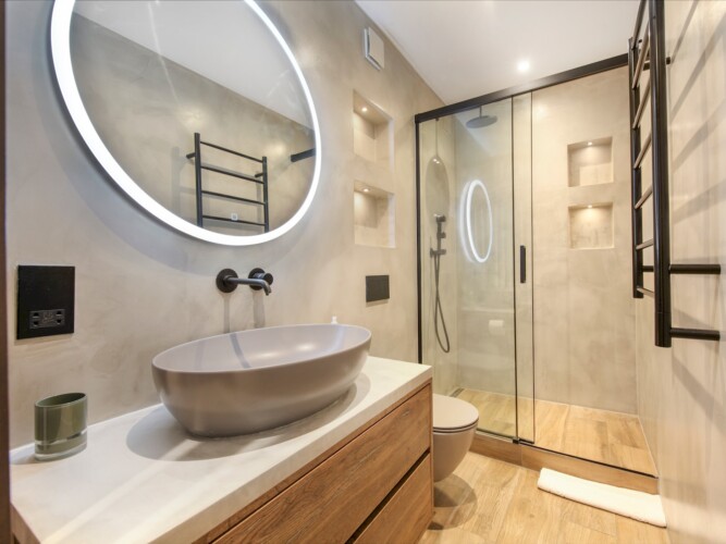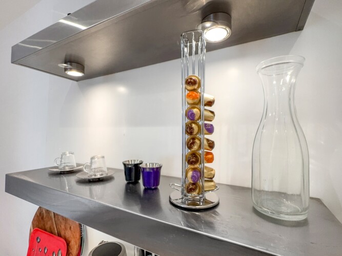 A fully equipped kitchen with modern appliances and contemporary bathrooms.