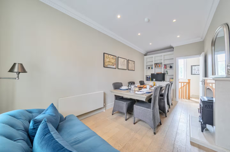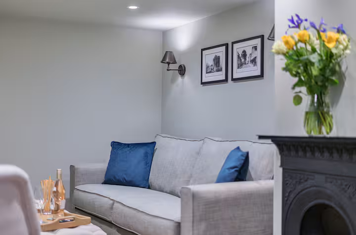 Complemented by framed black-and-white artwork and classic wall lighting. Features a black cast iron fireplace (decorative), adding a touch of traditional character. Modern recessed lighting creates a calm ambience for evenings. Two beautiful armchairs for that extra seating.
