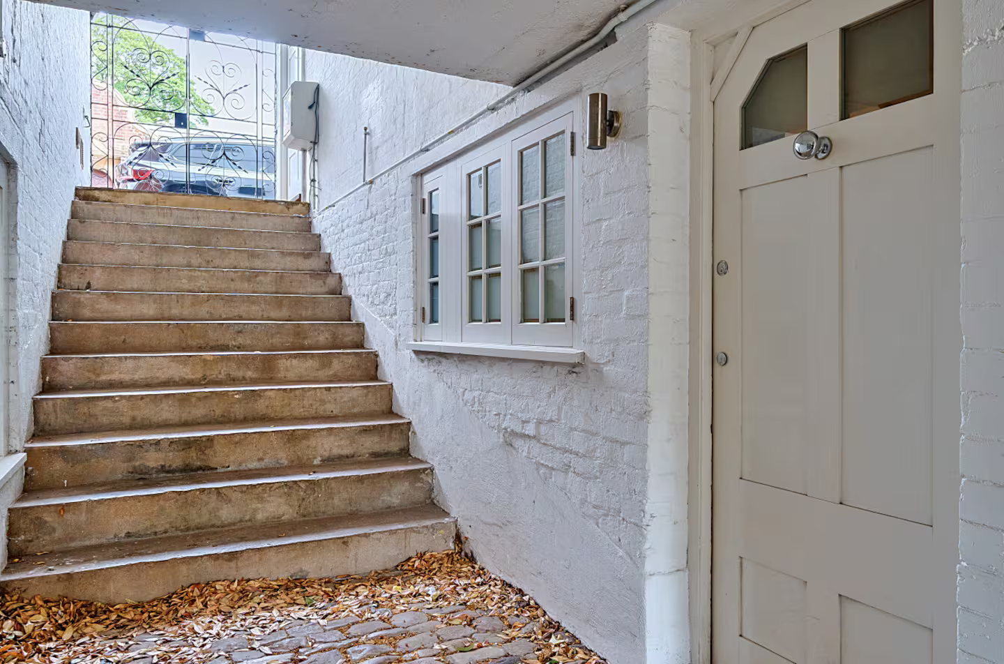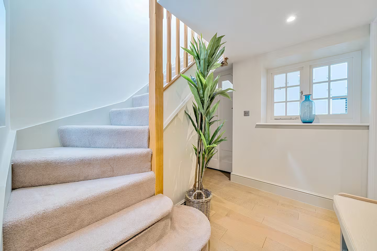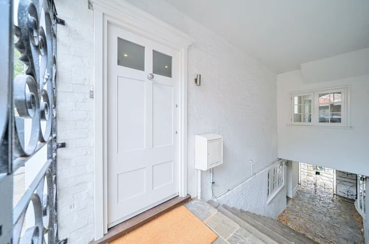 Step through the elegant archway into a stylishly restored property featuring classic sash windows, original details, and a welcoming atmosphere.
