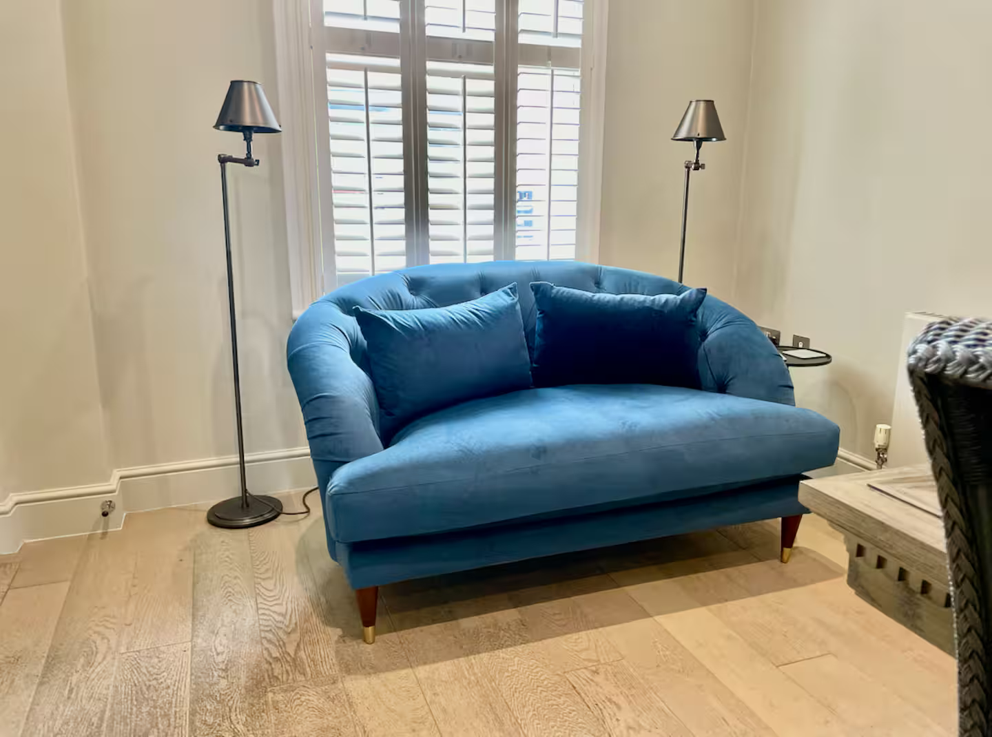 A cosy, snug lounge/living area with a green herringbone large, two-seater sofa, enhanced by deep blue velvet scatter cushions.