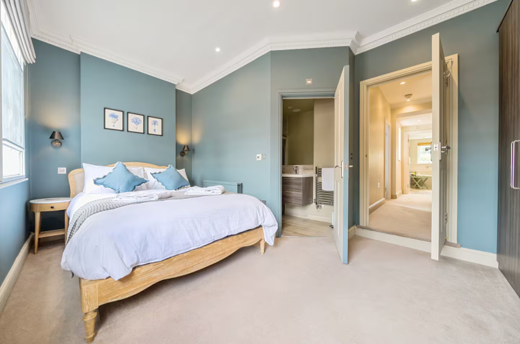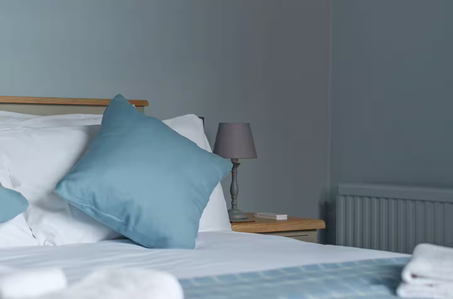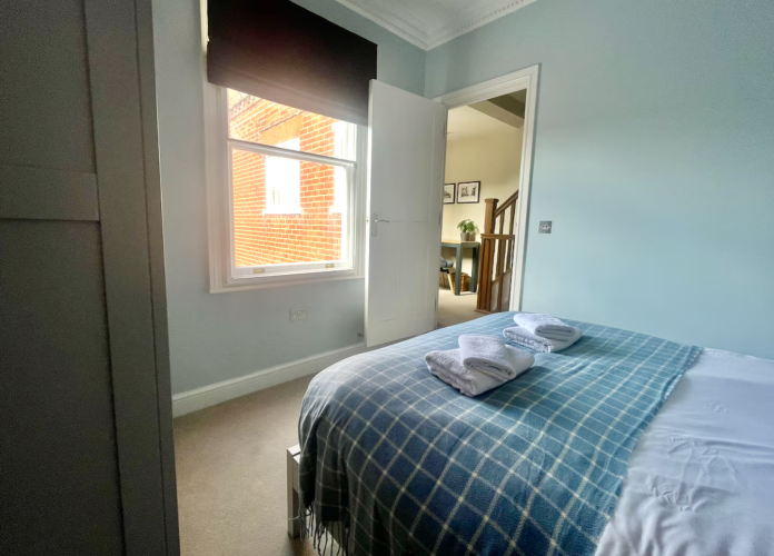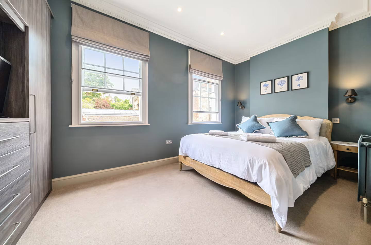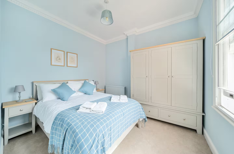 Decorated in a light pastel blue, making the space feel bright and open. Features a double bed with crisp white linen and pale blue plaid blanket, and cushions. Includes bedside tables with matching lamps and a large freestanding triple wardrobe for ample storage. Positioned next to a large sash window for natural daylight and ventilation.