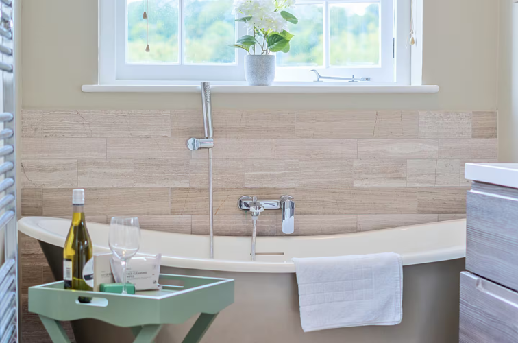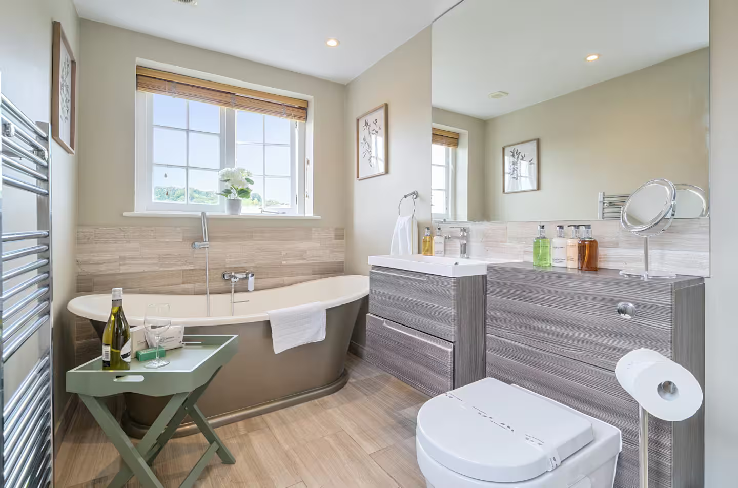 Toiletries and hand soap for your convenience. Dual windows with countryside views make for the perfect relaxation setting. Finished with natural wooden floors, a heated towel rail, and a folding tray table. There is also a good-sized shower for use.
