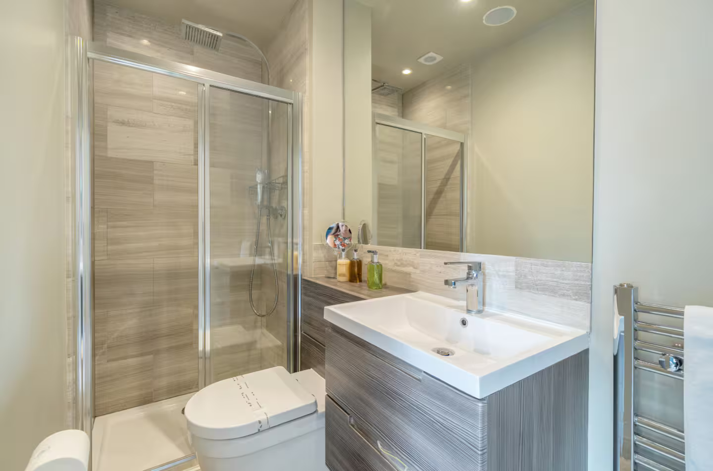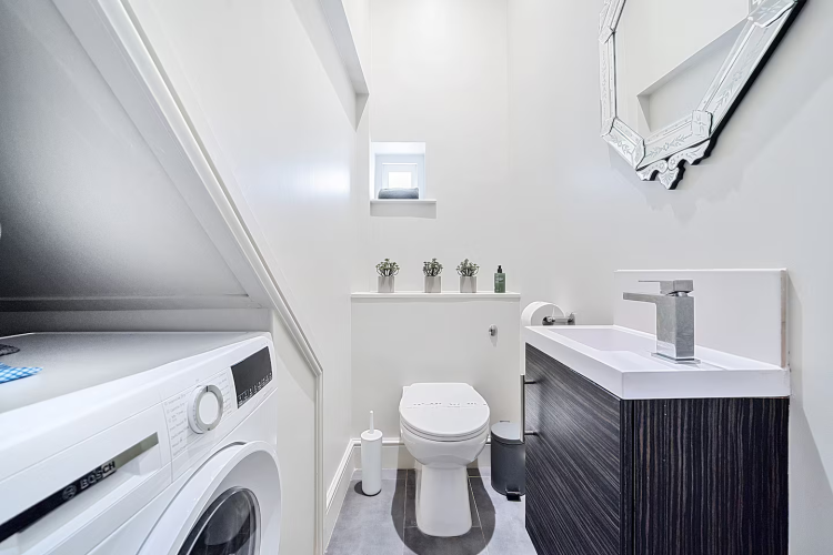 Conveniently located on the lower ground floor near the entrance. Contains a toilet, washbasin, and tasteful neutral décor. The washer/dryer is also located in this room for convenience.