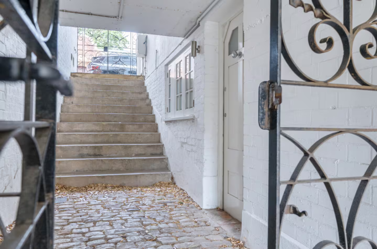You’ll enter through a charming black wrought iron gate beneath a white archway, leading to a peaceful cobbled courtyard. Though tucked away, you’re right in the heart of the action – cafés, shops, and historic sites are all just around the corner.