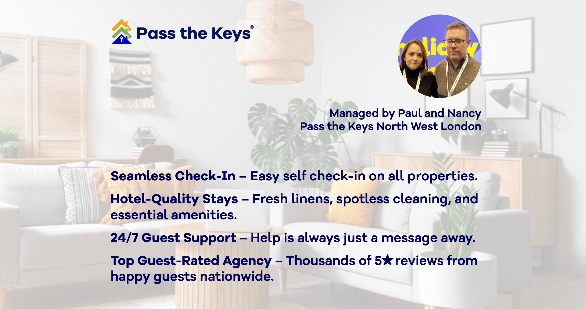 We are Paul and Nancy and are the partners for Pass The Keys, North West London. We are a team of two and we have many years of experience working in the residential London market.  Our properties are all in North West London. We provide a whole range of services from professional cleaning and laundry to maintenance services that the property may require. We are operational seven days a week which takes the day to day hassle away from the host. The Guests will find our service to be to a very high standard.