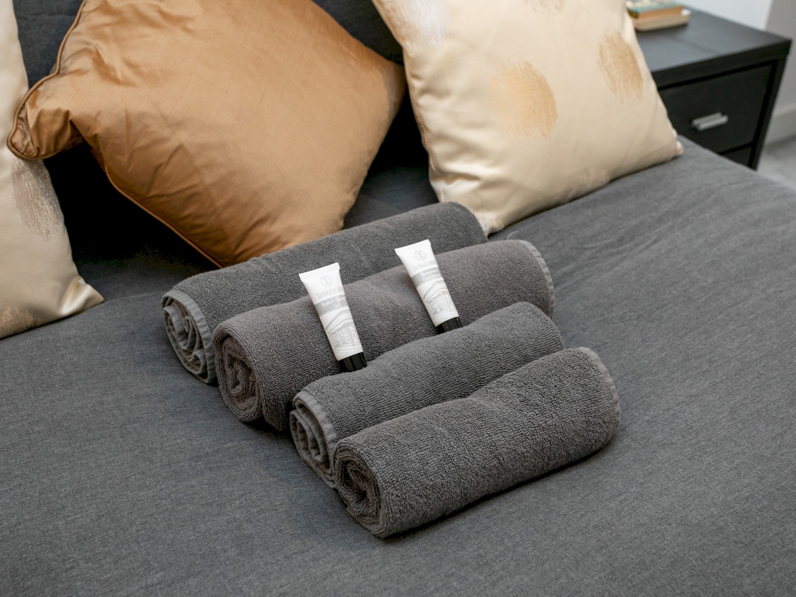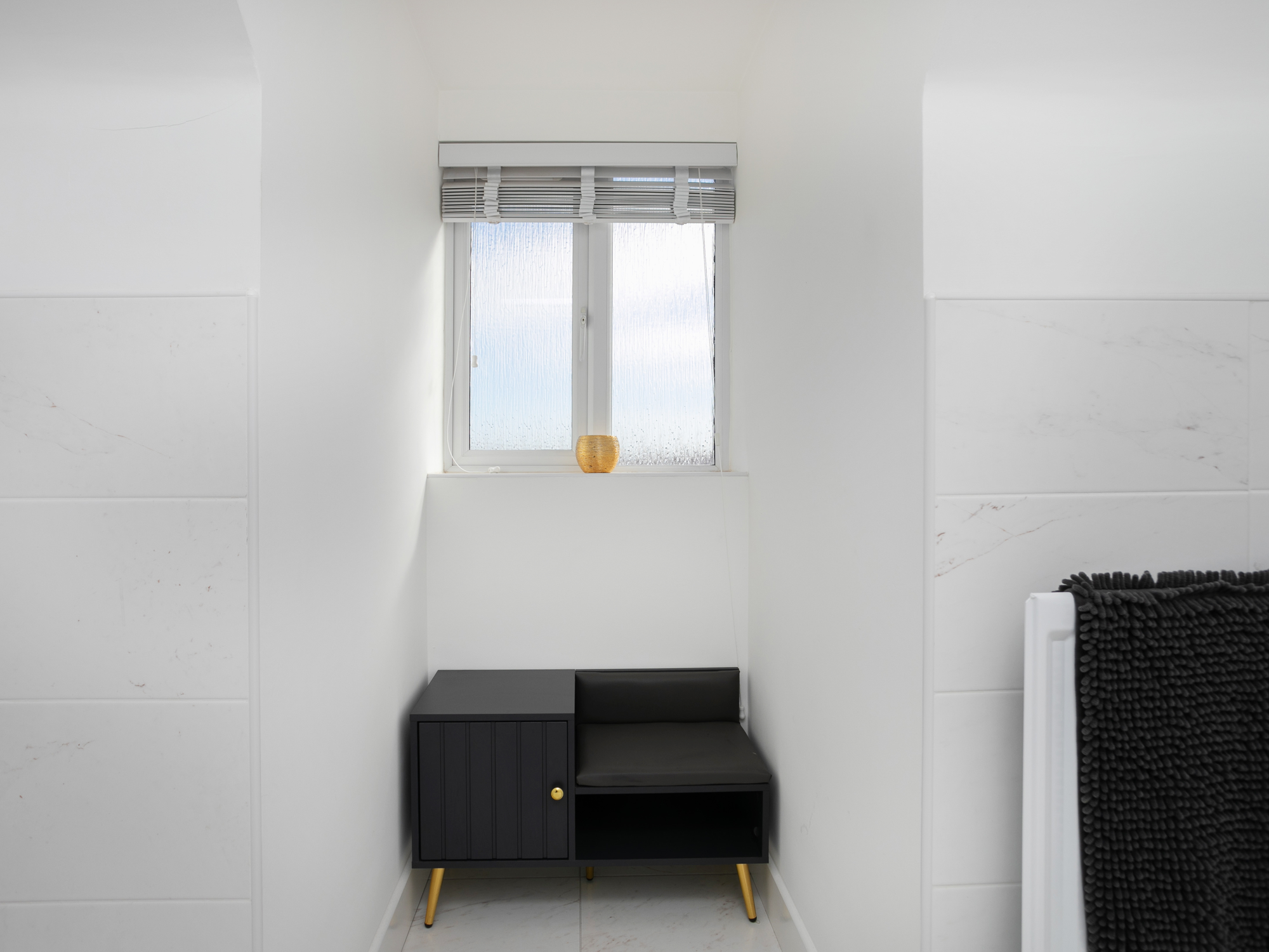 As you move upstairs, the first floor brings balance and versatility . A dedicated office space with a desk, chair, and monitor makes working remotely effortless, while the yoga room provides a peaceful place to stretch, meditate, or recharge your energy. You’ll also find two inviting bedrooms here: one with a comfortable double bed and ensuite , and another with two single beds — ideal for children, friends, or colleagues. The family bathroom features a relaxing bath-shower combo, perfect for long soaks or quick refreshes before heading out.