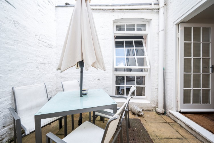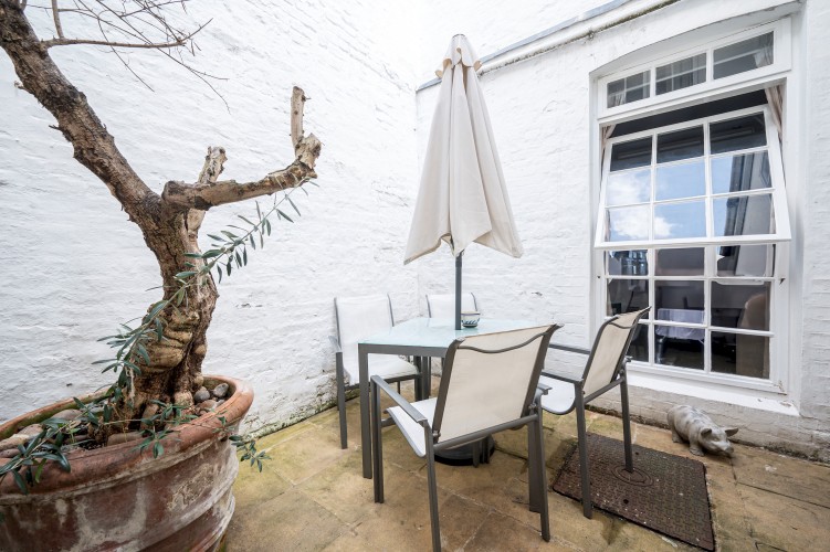 Head downstairs and you’ll find the quiet bedroom with a comfy double bed, a modern bathroom with a proper walk-in shower, and a little courtyard patio that’s surprisingly peaceful for such a central spot. It’s a space I’ve loved — coffee in the mornings, wine in the evenings, or just stepping out for air.