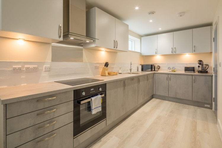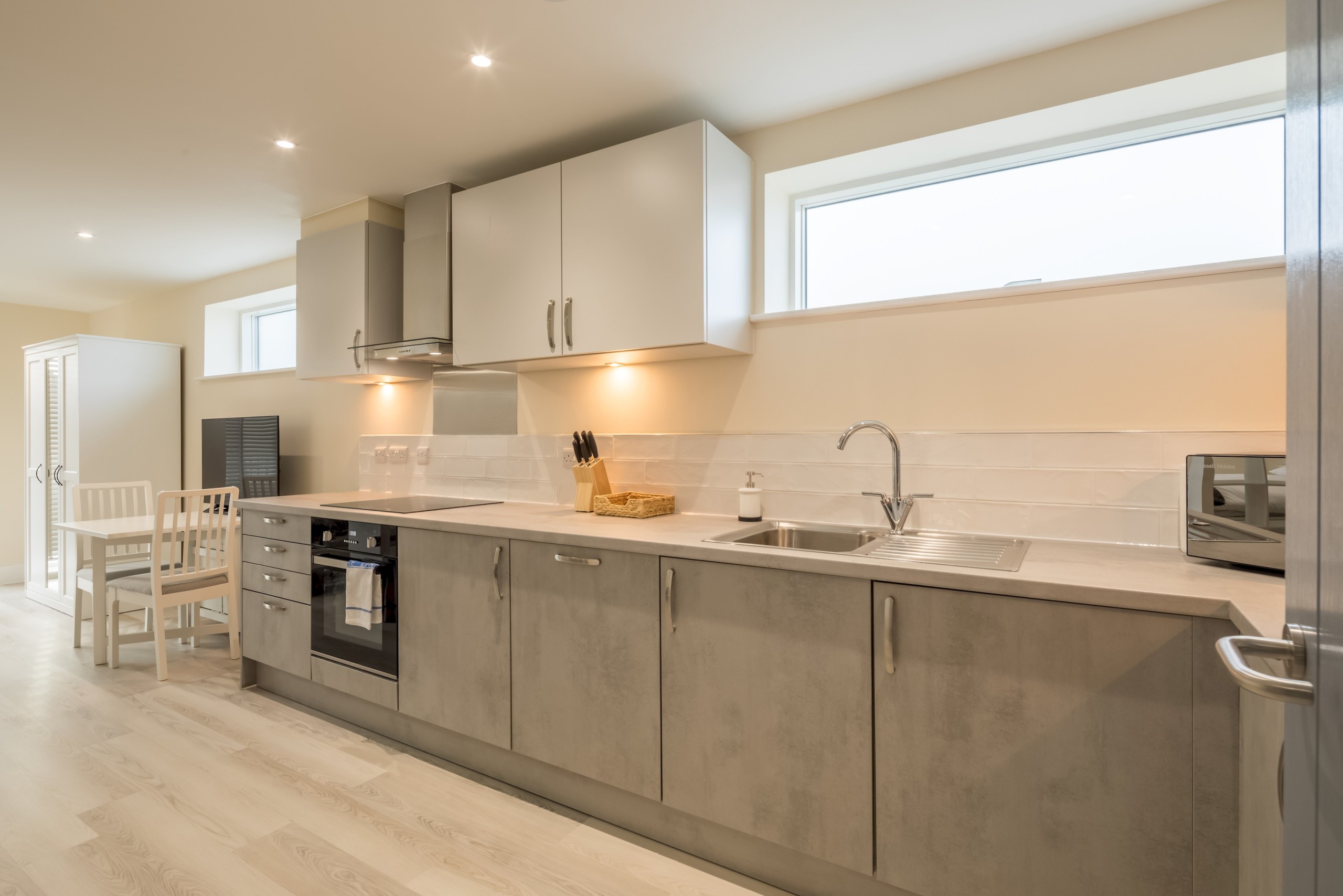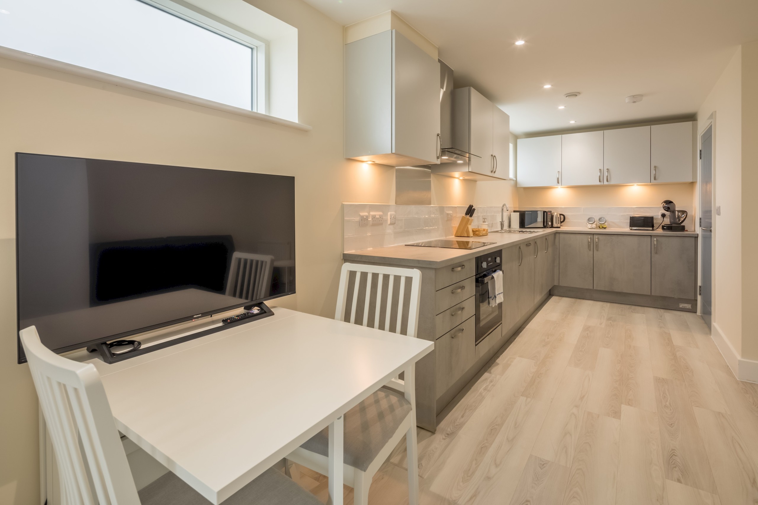 Prepare delicious meals in the sleek, fully equipped kitchen with exquisite decor, and gather around the beautiful table for two. The kitchen has an electrical hob, oven, fridge/ freezer, toaster, kettle and cooking equipment.