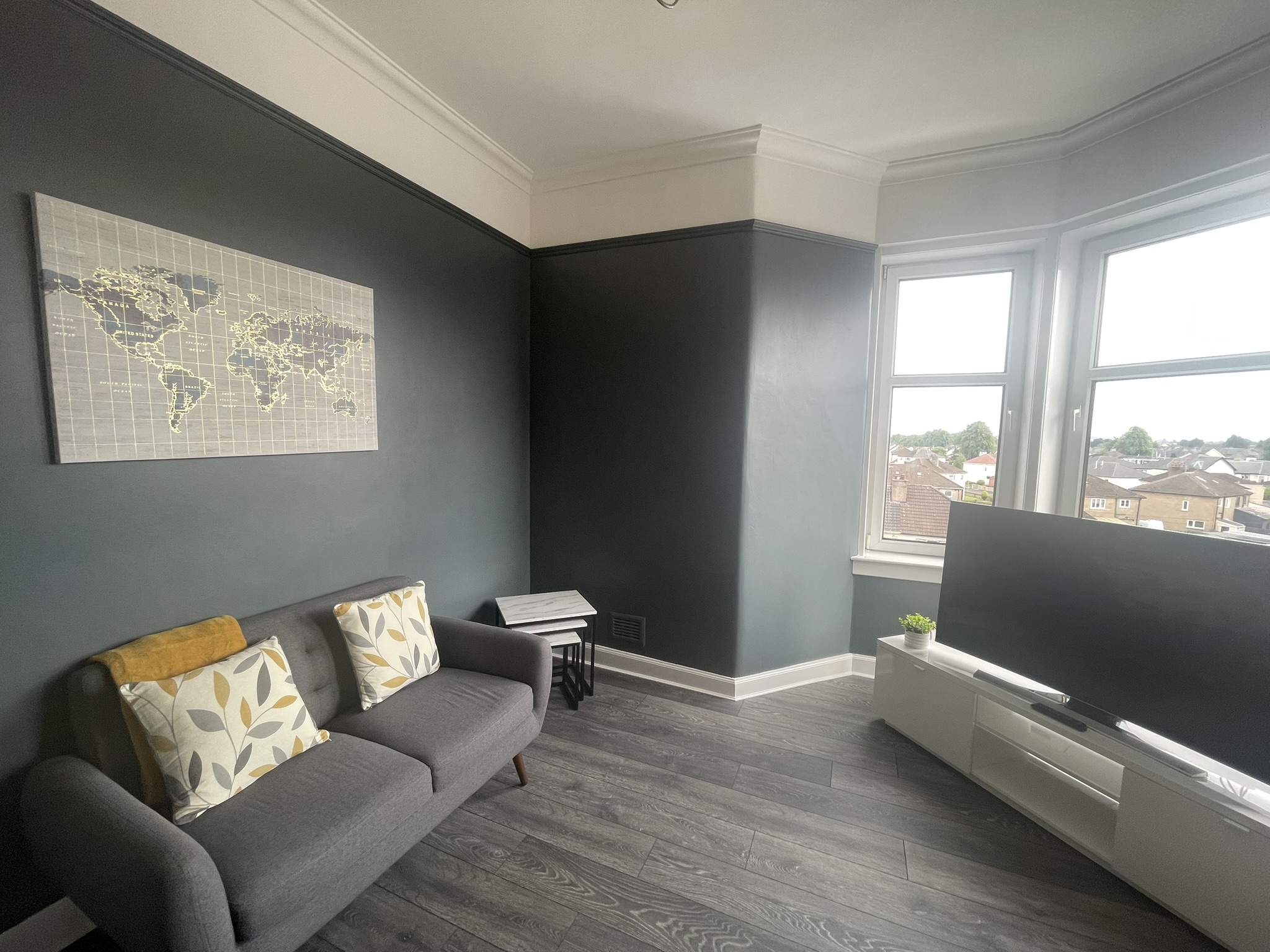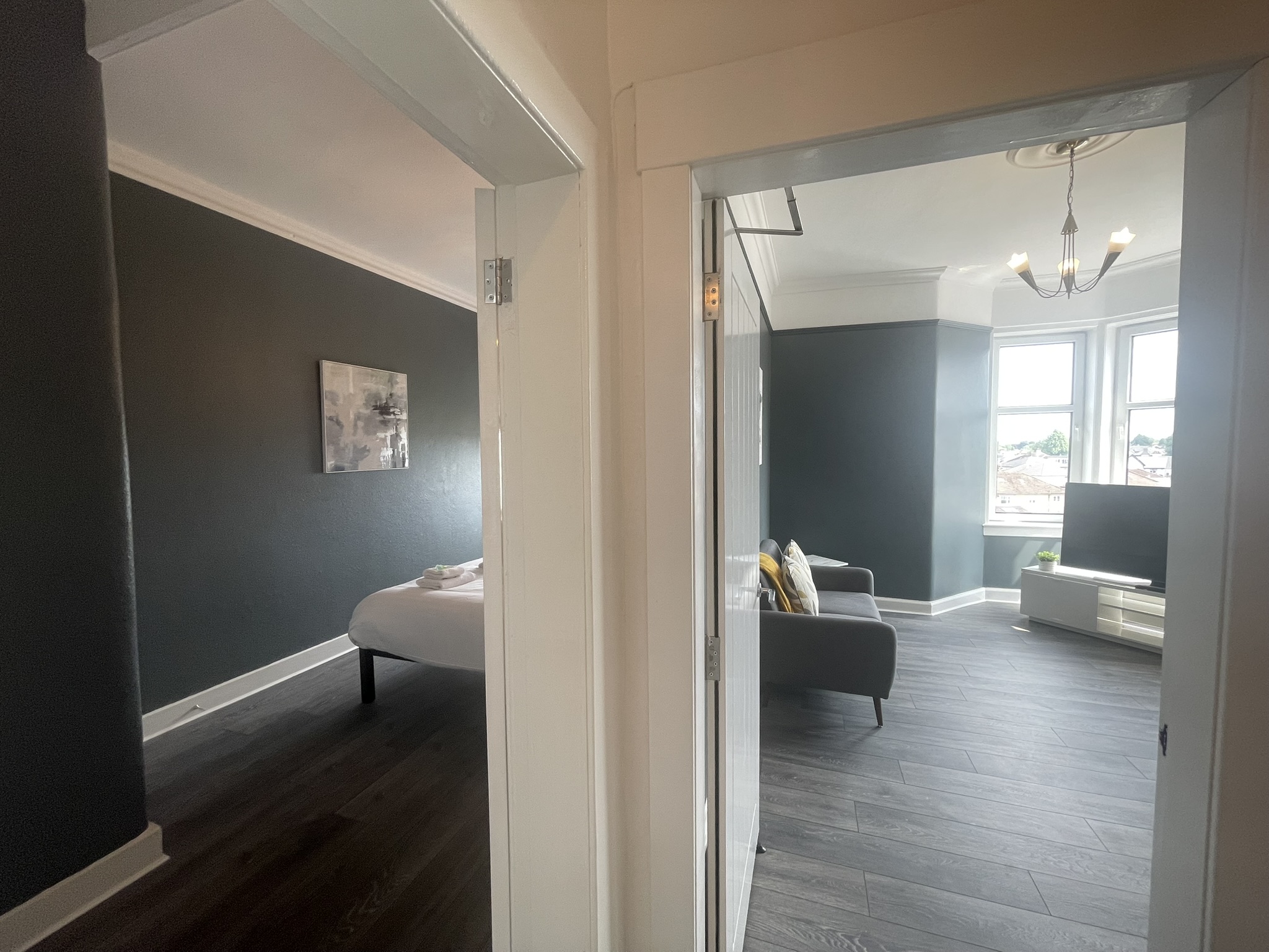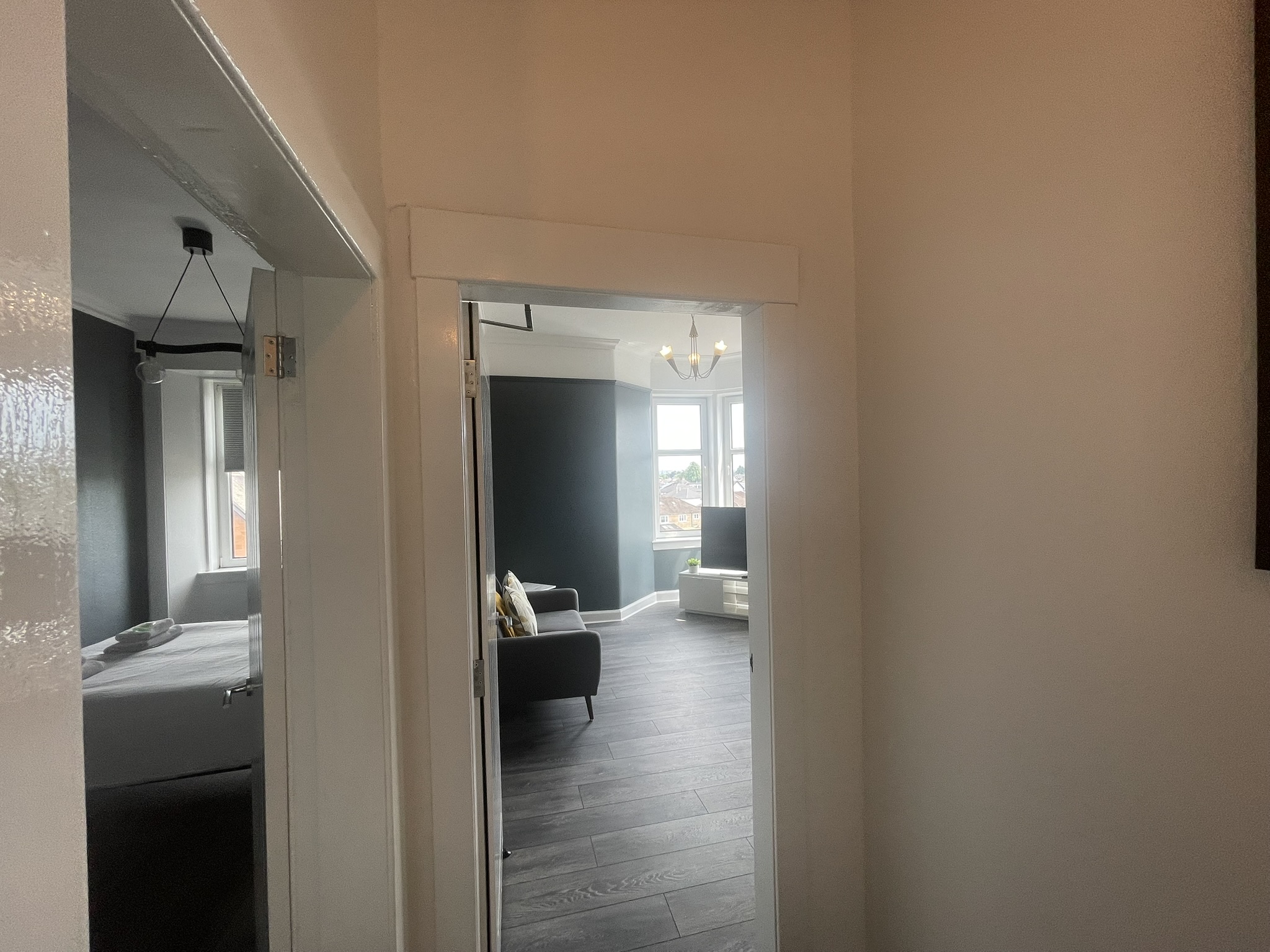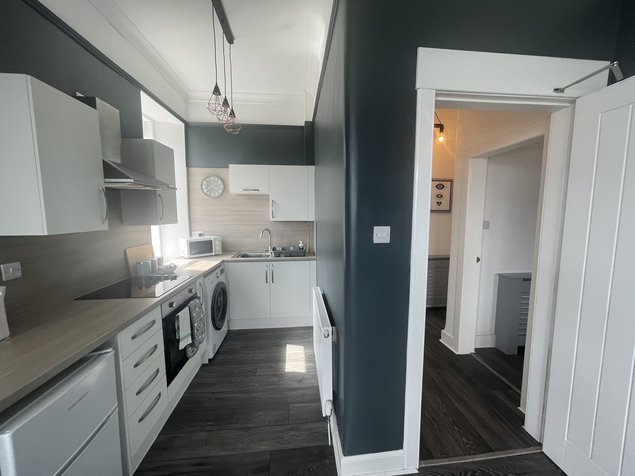 A well located flat in Renfrew on a corner of Paisley Road. Recently renovated, this 2 bed offers an open plan living/kitchen/dining area with great views over the town. Close to Braehead Shopping Centre, Soar and only a couple of minutes to Glasgow’s M8 Motorway at Junctions 25a and 26. Frequent bus service to City Centre right outside. Professionally cleaned, linen and towels are removed from the property after each stay and replaced with freshly laundered supplies and toiletries.