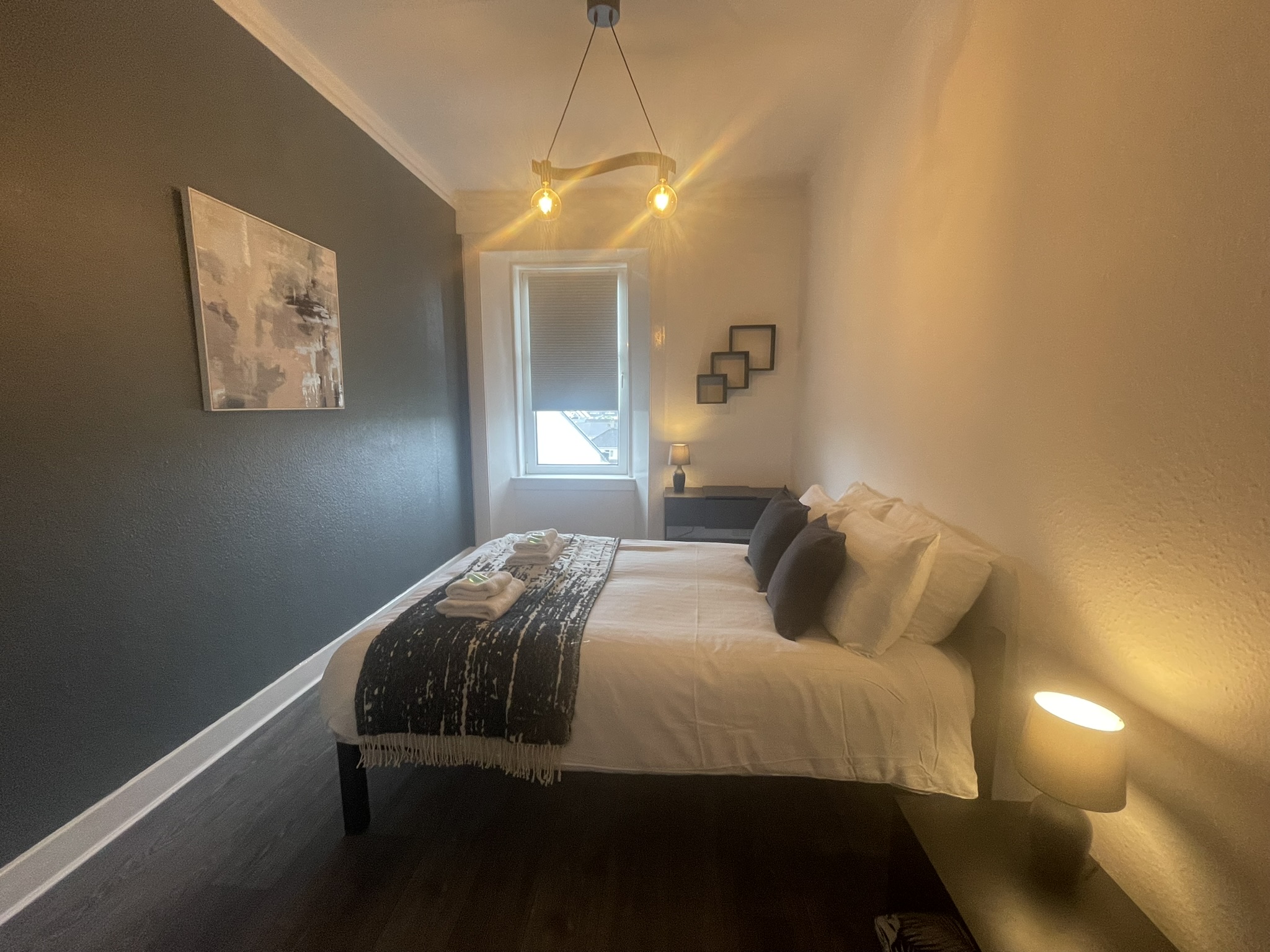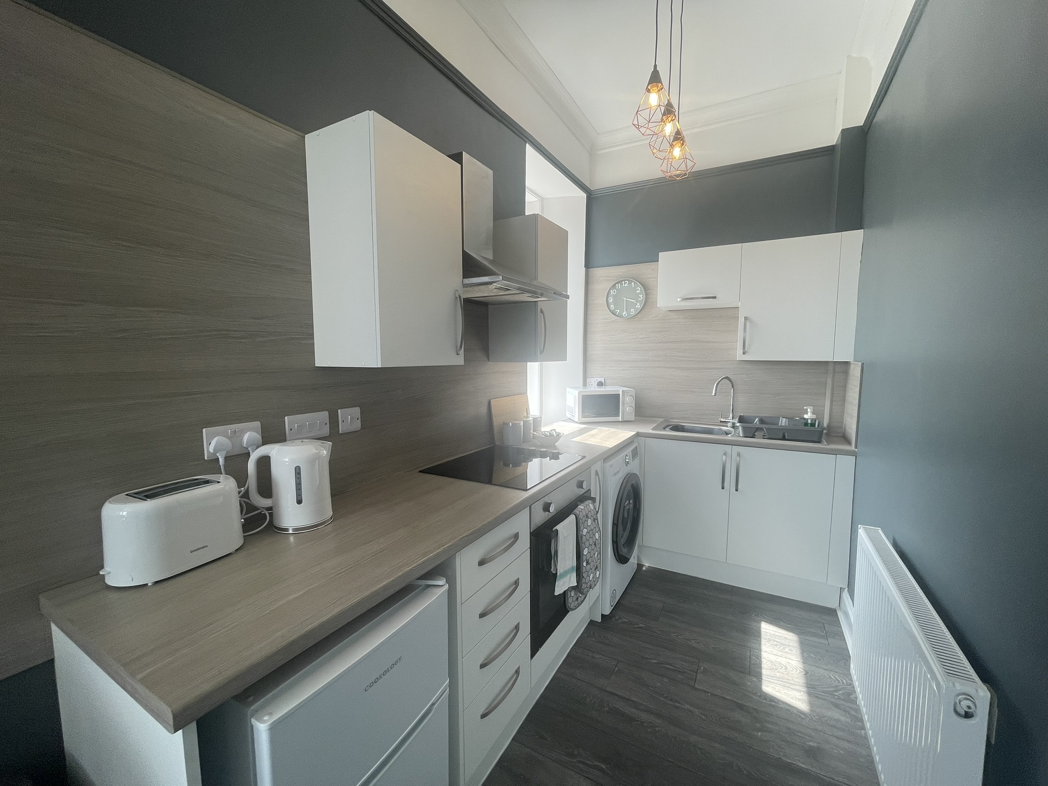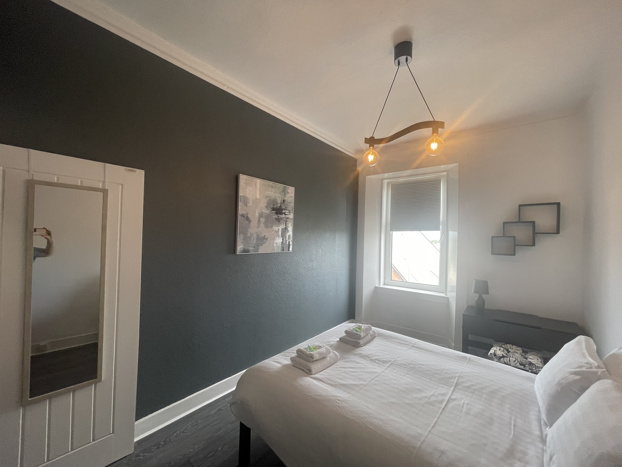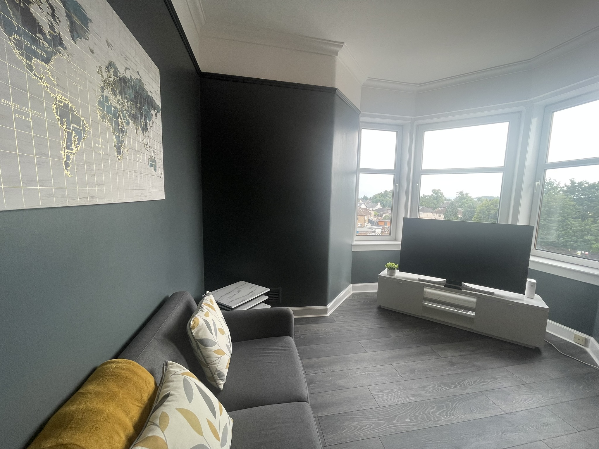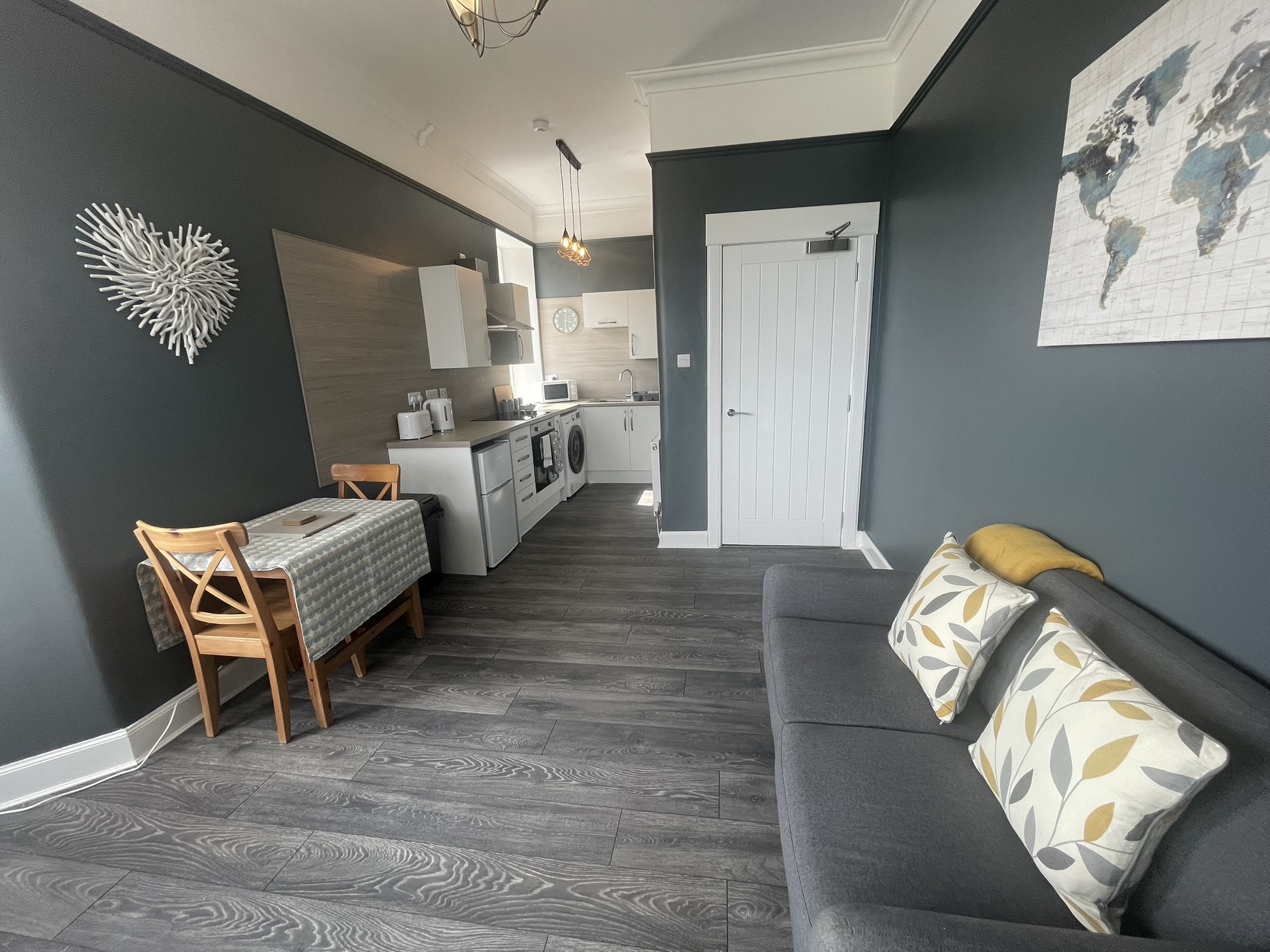 A well located flat in Renfrew on a corner of Paisley Road. Recently renovated, this 2 bed offers an open plan living/kitchen/dining area with great views over the town. Close to Braehead Shopping Centre, Soar and only a couple of minutes to Glasgow’s M8 Motorway at Junctions 25a and 26. Frequent bus service to City Centre right outside. Professionally cleaned, linen and towels are removed from the property after each stay and replaced with freshly laundered supplies and toiletries.