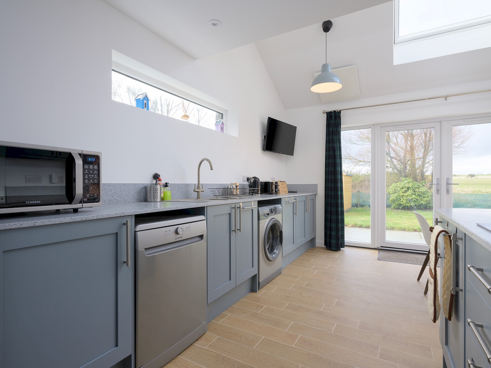 The delightful south facing kitchen / sunroom to the rear comes fitted with washing machine, dishwasher, oven and microwave. The rear doors open out into a spacious private patio and garden from where you can see golfers complete their round on the 18th of the Craighead Links.