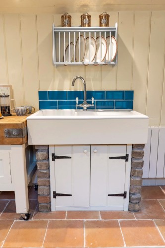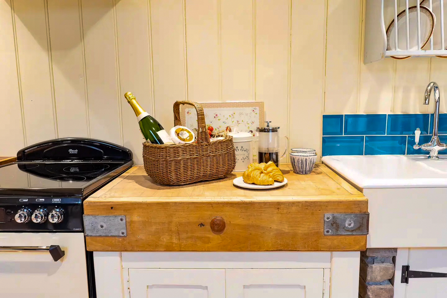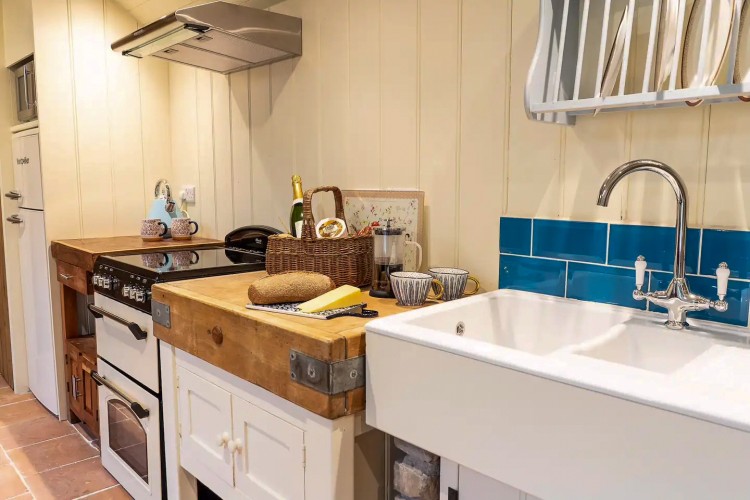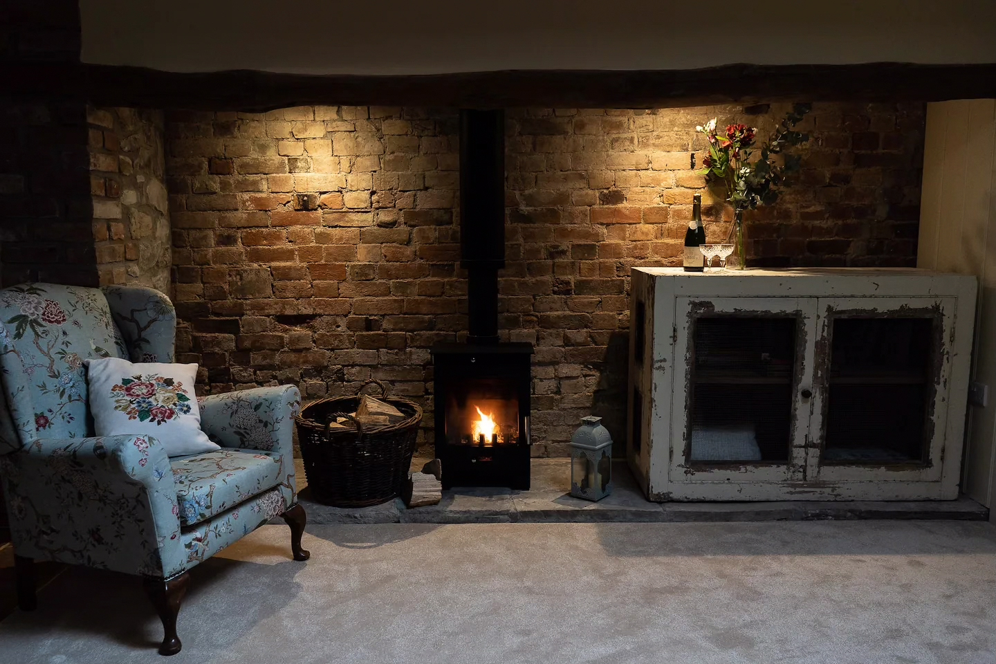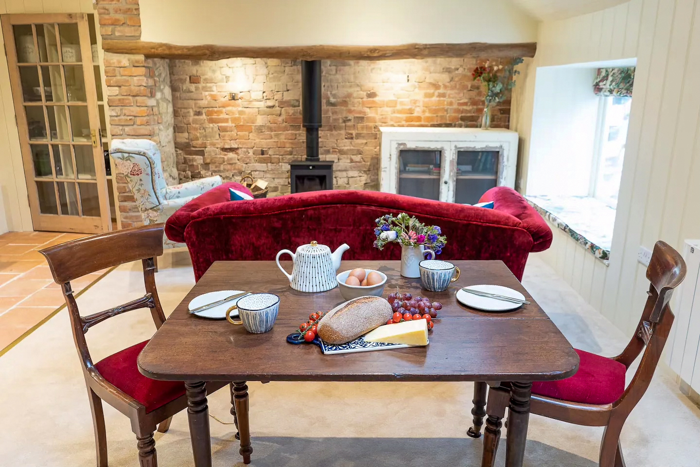 The barn is on one level and the living area has an open plan layout with fully equipped kitchen, dining table, large comfortable sofa and wing back chair. There is a beautiful inglenook fireplace with log burner perfect for relaxing in front of after a long walk whilst enjoying your favorite film or box set on the Smart TV. A basket of logs and kindling is included.