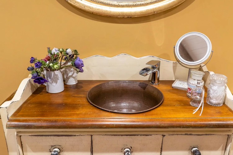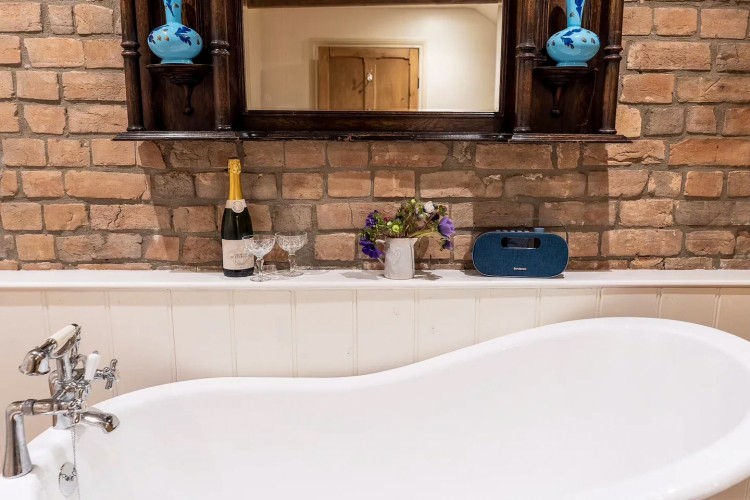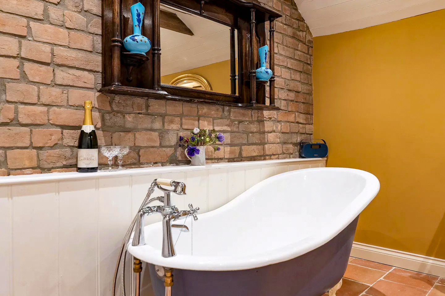 The luxurious en suite bathroom has a generous sized walk in shower as well as a roll top slipper bath and vintage washstand with lovely copper basin.