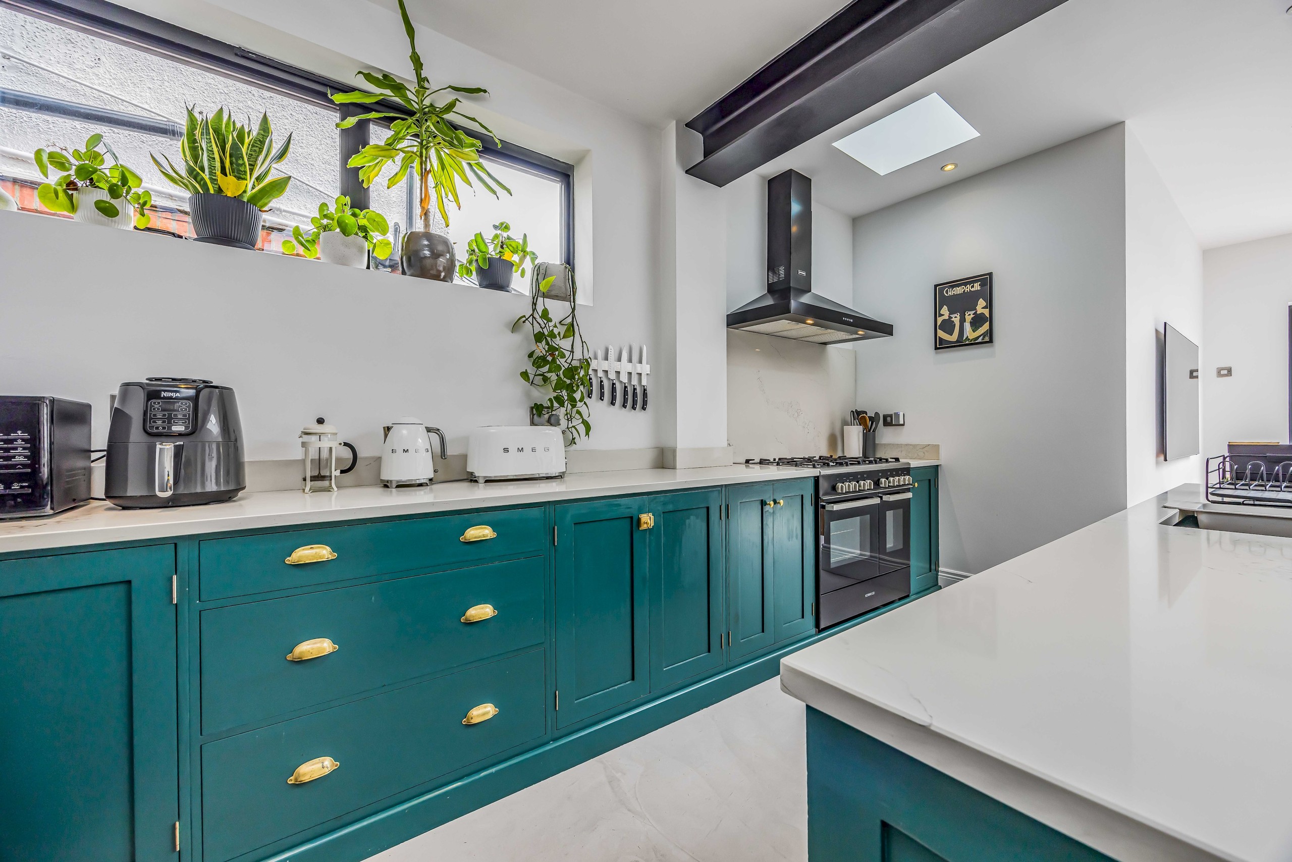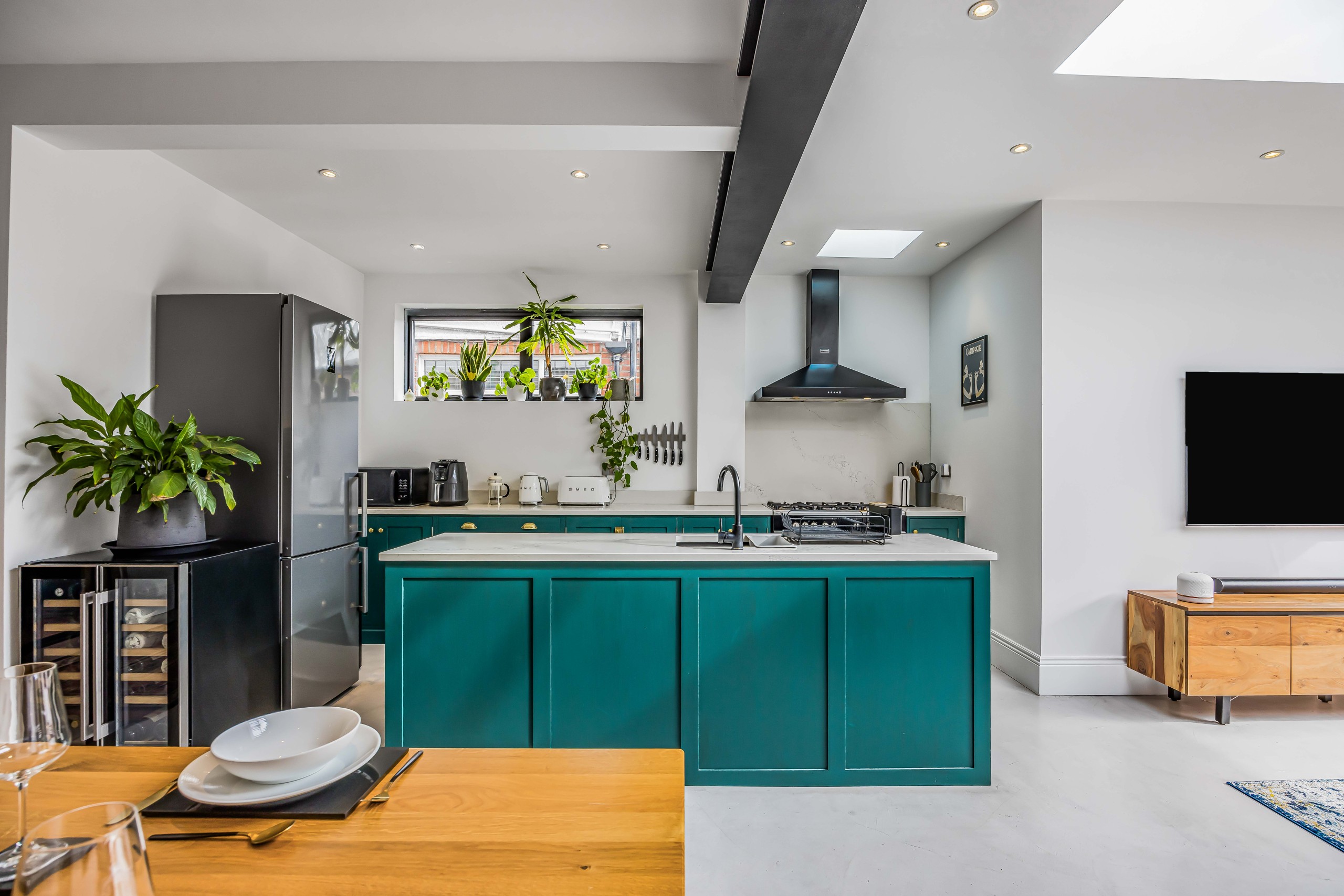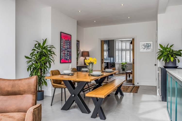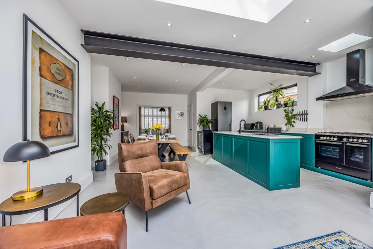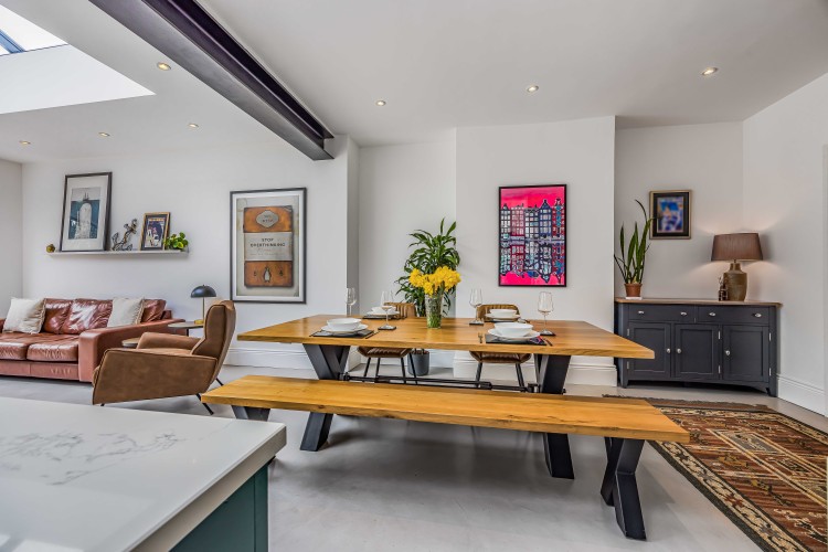 After a day of exploring, unwind in the bright sitting room, complete with an L-shaped sofa, armchair, and Smart TV (please use your own login for streaming). The open-plan kitchen, with its spacious island, is perfect for socialising while cooking a meal with friends or family. It overlooks the dining area, which seats 4, and leads into a a second sitting area with a Smart TV, opening up to the garden.