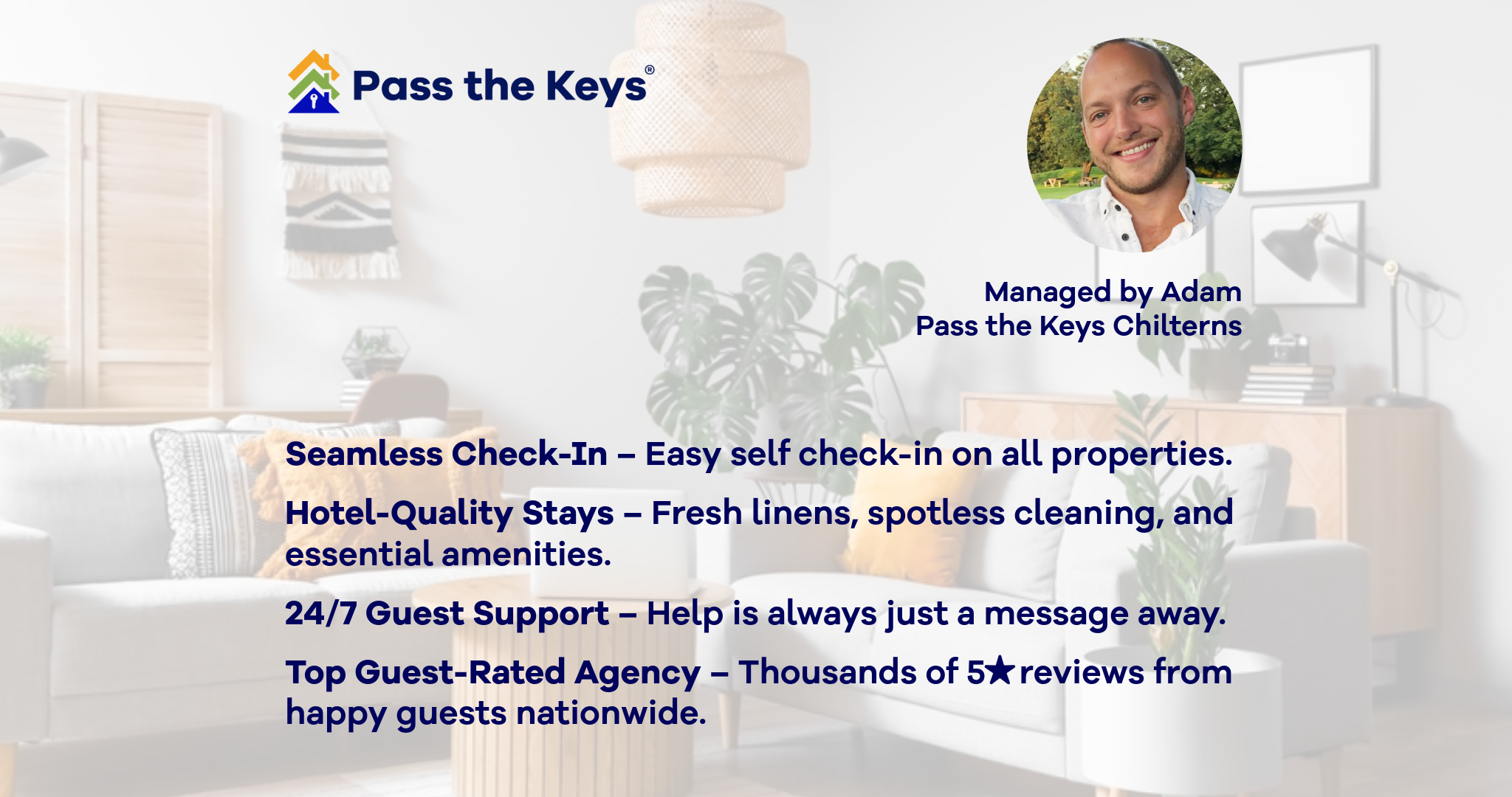 Hello, I am Adam from the Chilterns territory. I live near Amersham and have spent most of my life in the Chilterns area. I became a Pass the Keys partner in 2023 with over 20 years of hospitality experience. I recently completed a profitable sale of two successful multi-award winning country dining pubs of which one was a pub and restaurant and the other a country pub & inn with 7 boutique letting rooms. My love and passion for all things hospitality, guest experiences and local operating knowledge combined provide me with a big advantage in the short-let and holiday-let management market within the Chilterns. Having worked in hospitality my entire life within the Chilterns I have extensive knowledge of the area including irreplicable experience of how guests like to be treated. Being one who takes pride in his work and has an eye for detail rest assured your property will be in experienced and safe hands.
