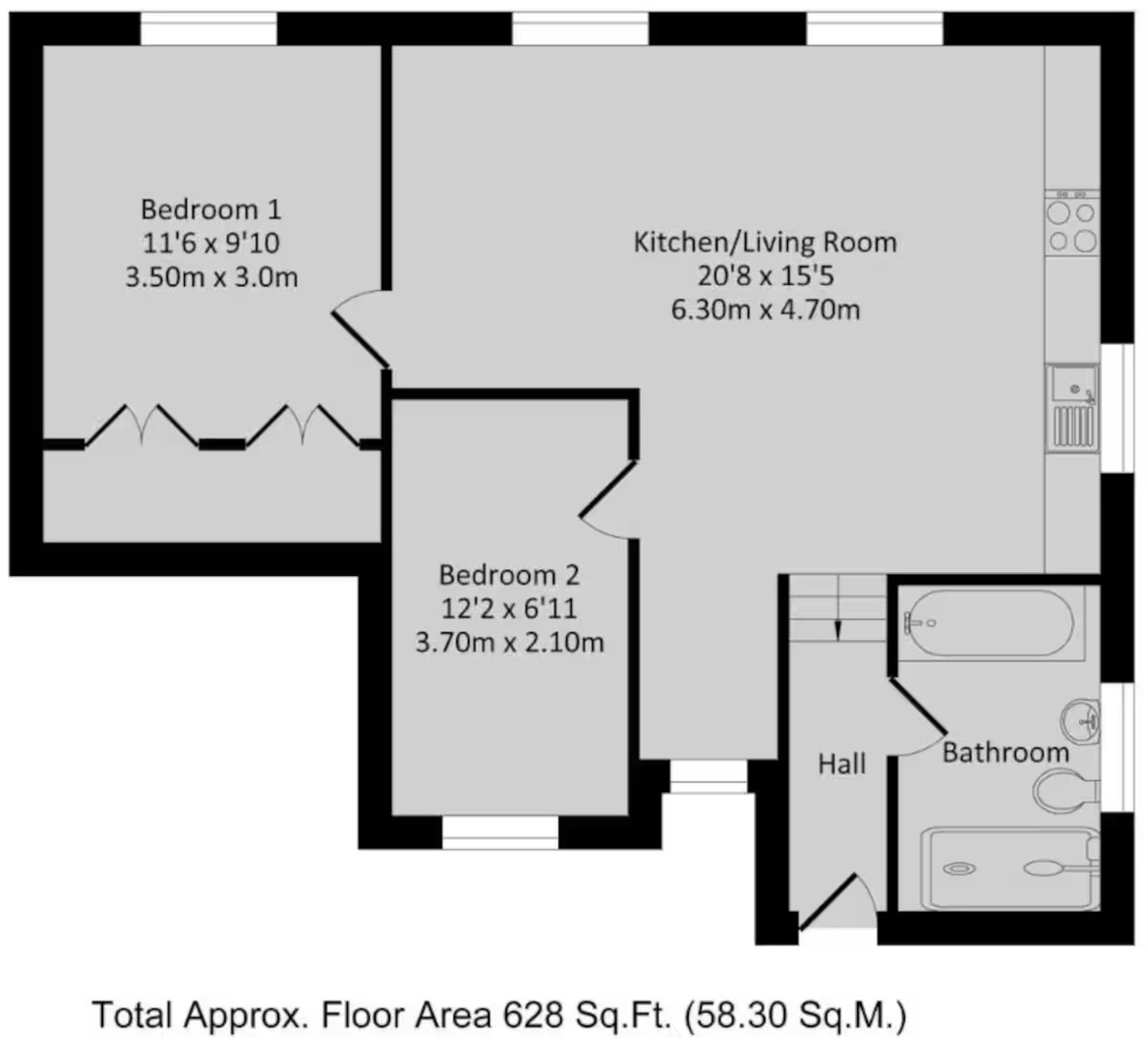 Featuring a double bedroom and a single, open plan kitchen-dining-living area and bathroom with freestanding bath & shower enclosure.