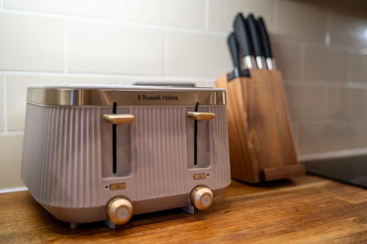 The modern fully-equipped kitchen provides everything you need for a comfortable stay including a fridge, freezer, electric oven/hob, washing machine, microwave, kettle & toaster. The stylish dining table seats up to 4 guests.
