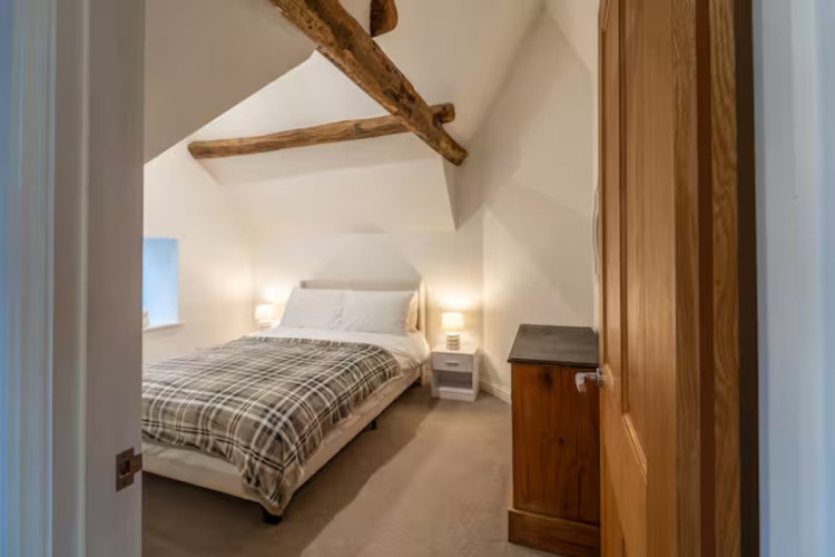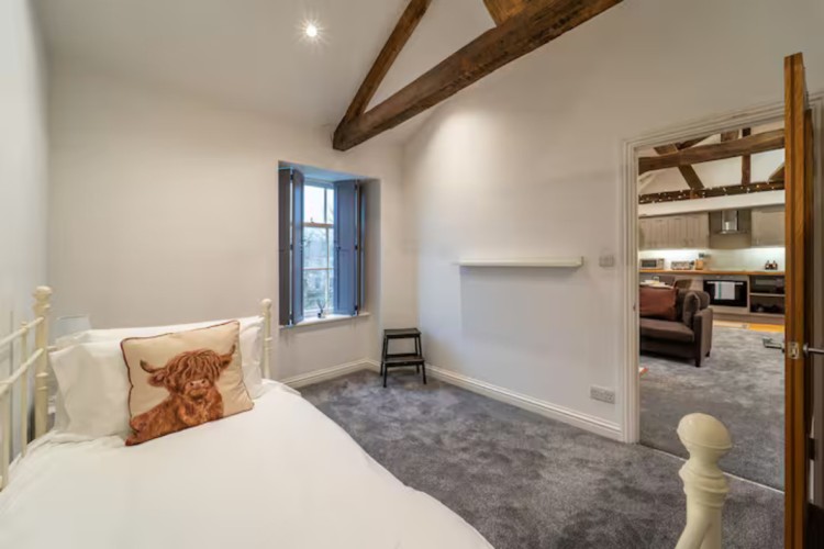 Head up into the main living area with high ceilings and exposed beams, with bespoke wooden shutters enhancing the building’s characterful charm.