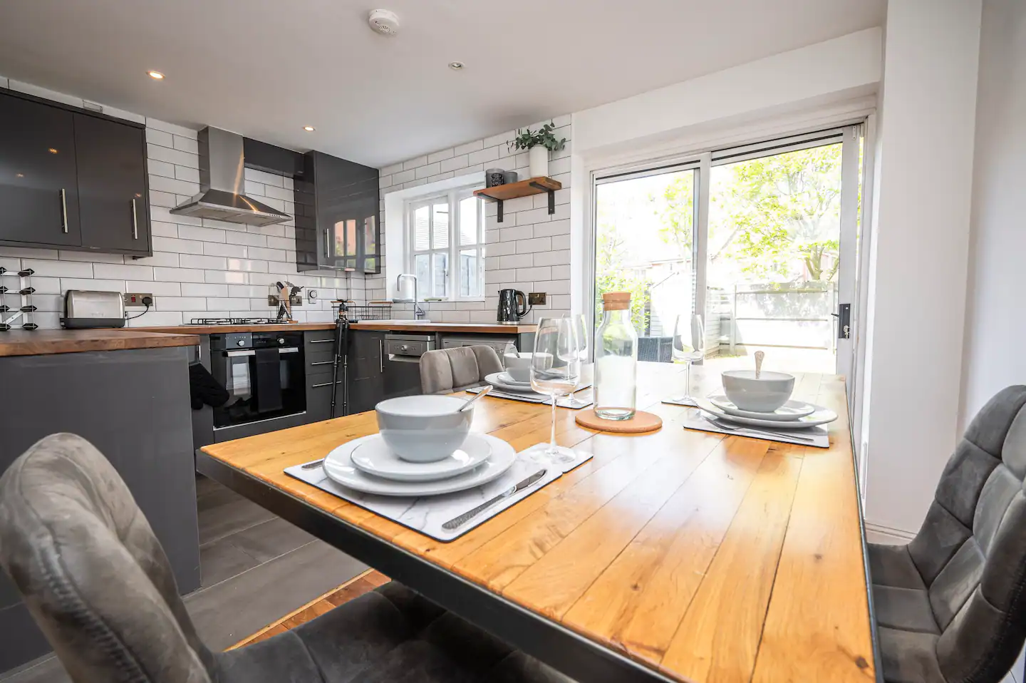 Moving through to the kitchen dining area, you will find a well equipped kitchen complete with washing machine and dishwasher. There is a stylish dining table for 3 people.