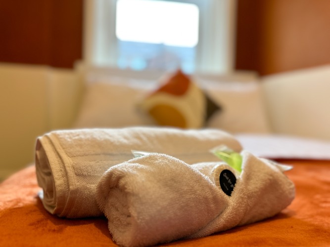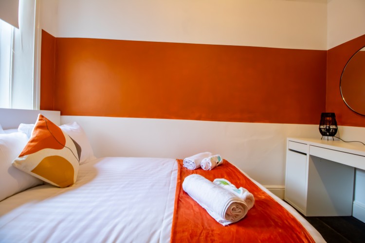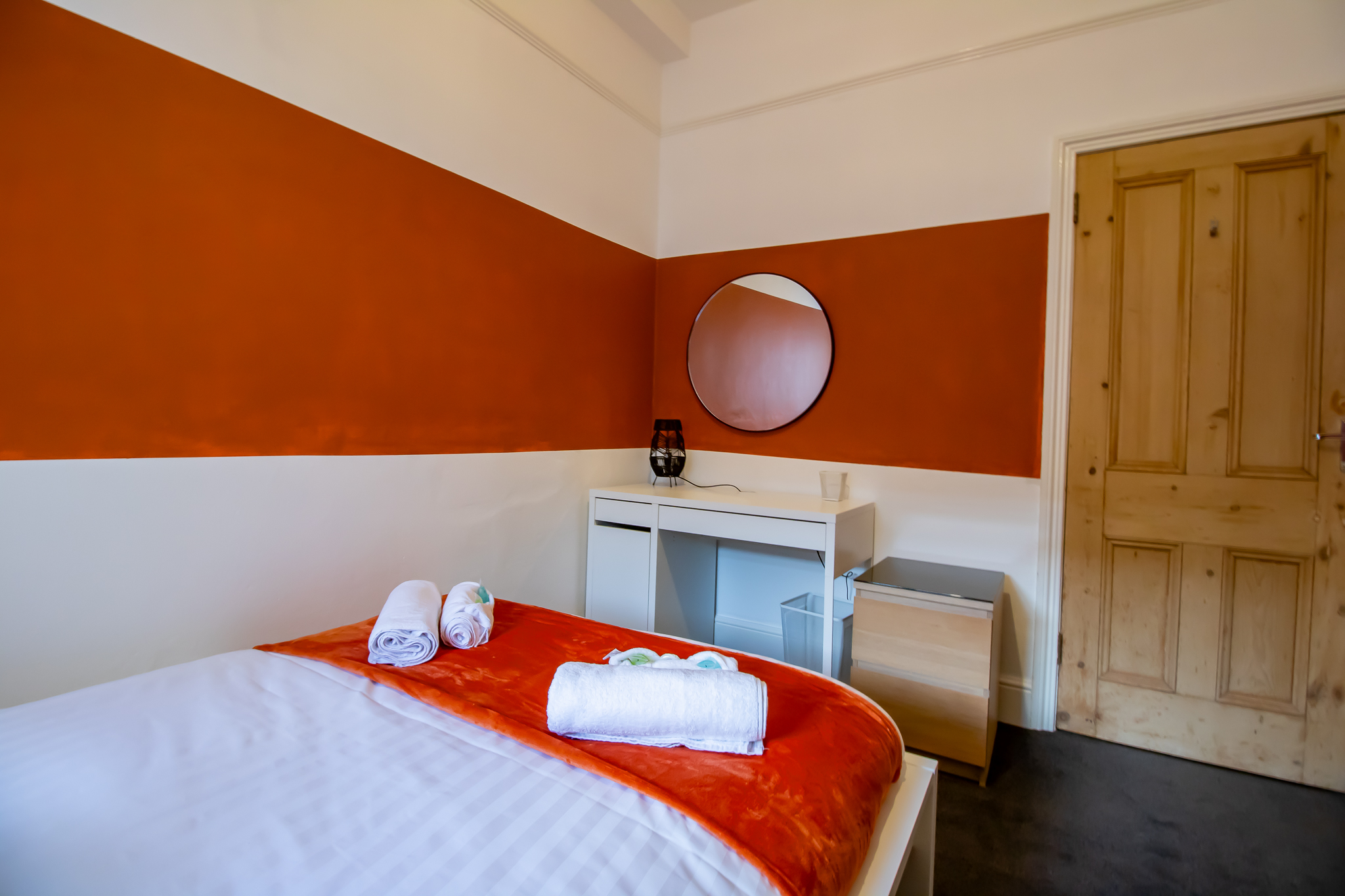 The property is accessible via a bright yellow door, number 63 Hazelwood Avenue. This is a private entrance and leads you straight into a the central hallway. The master bedroom is at the front of the property and contains a super king size bed, as well as a desk space for either working at or getting ready for the days activities.