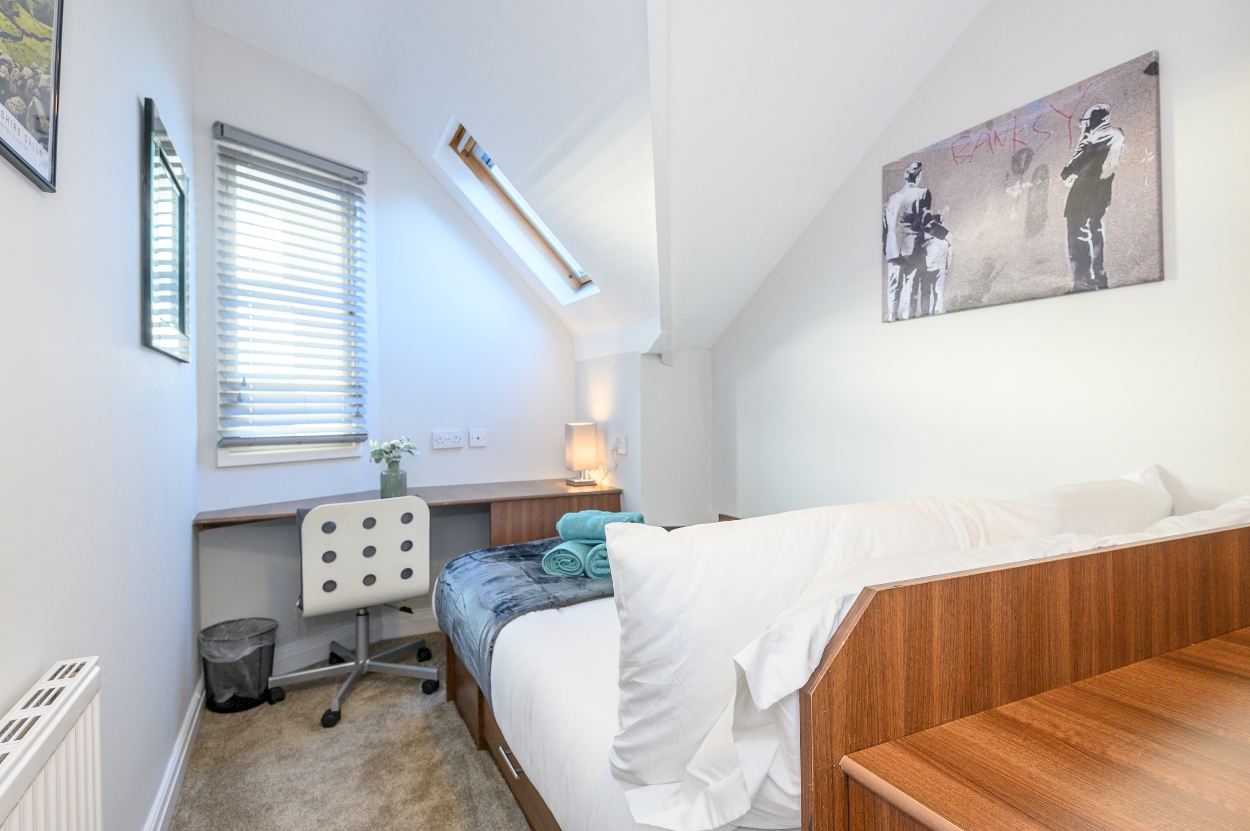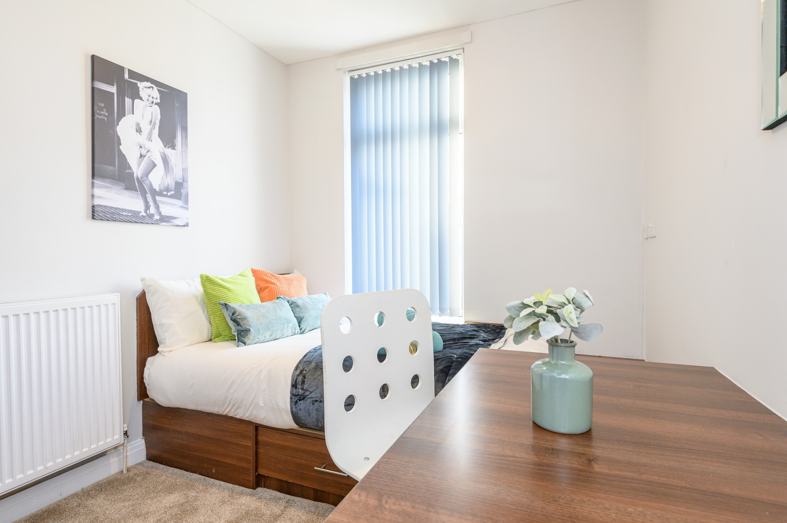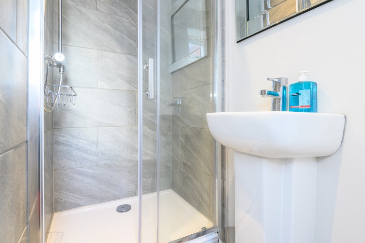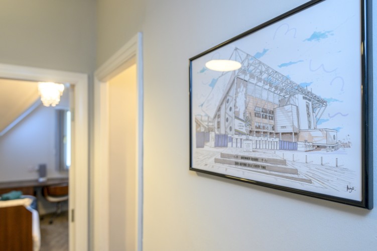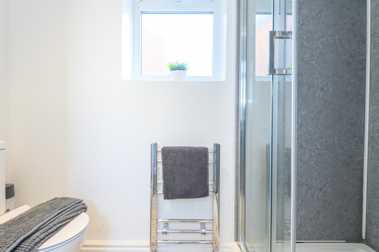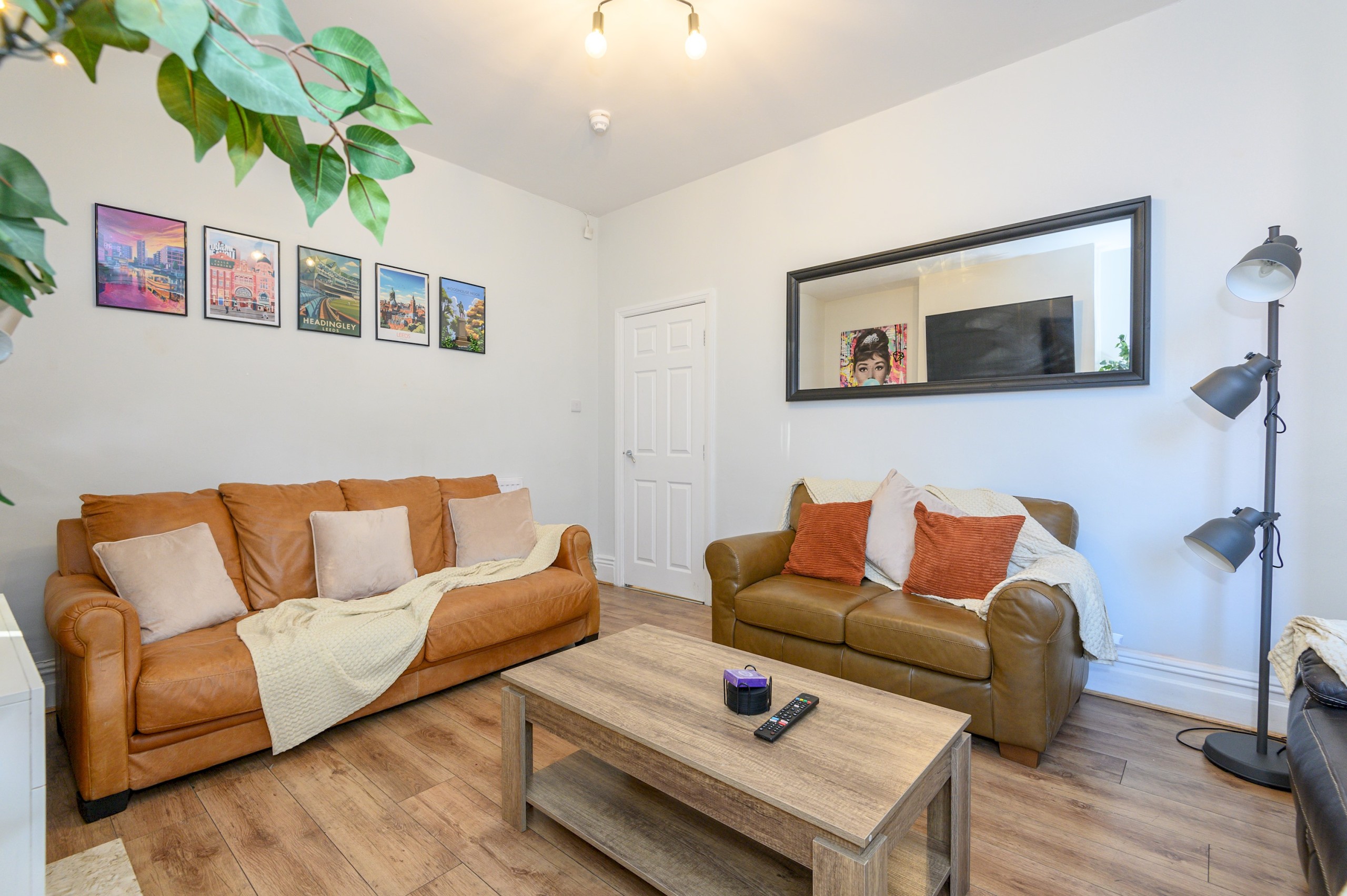 The living room is designed for comfort and togetherness, featuring a Smart TV for entertainment and an electric fireplace that adds warmth and a cosy ambiance. With plenty of seating, it’s the perfect spot for group gatherings, movie nights, or simply relaxing after a day exploring Leeds.