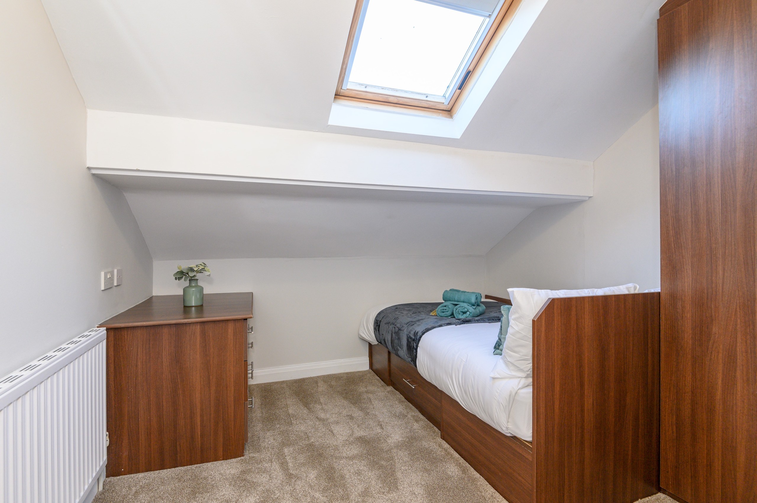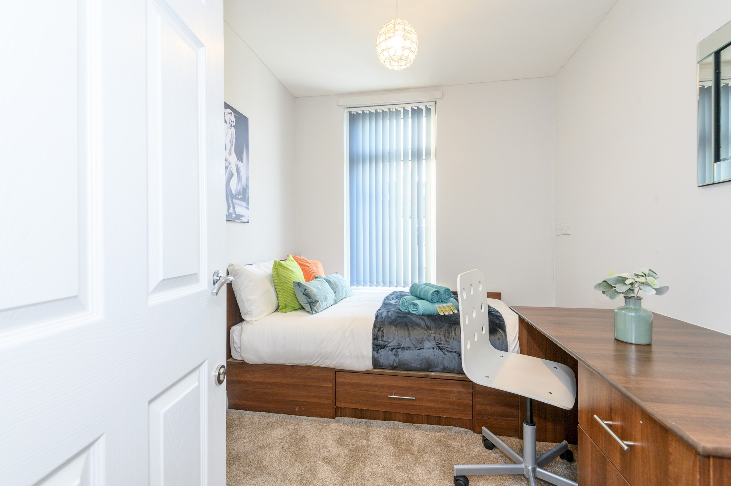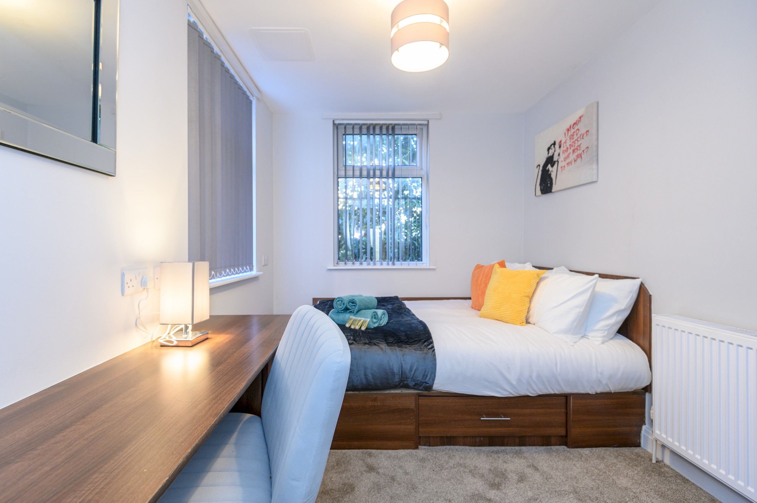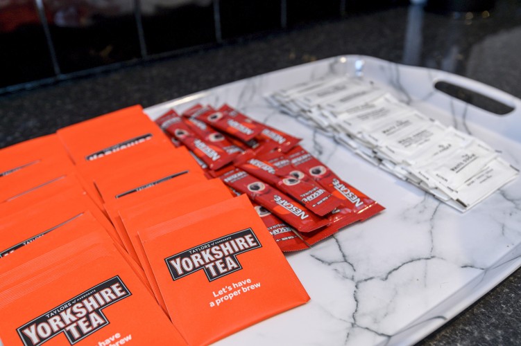 The living room is designed for comfort and togetherness, featuring a Smart TV for entertainment and an electric fireplace that adds warmth and a cosy ambiance. With plenty of seating, it’s the perfect spot for group gatherings, movie nights, or simply relaxing after a day exploring Leeds.