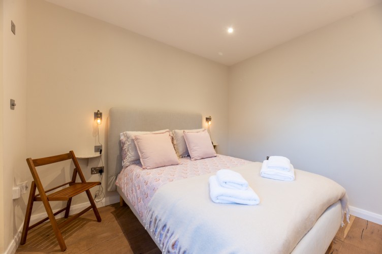 The first bedroom features a double bed and a beautiful en-suite bathroom with a stone bathtub. The second bedroom has a single bed.