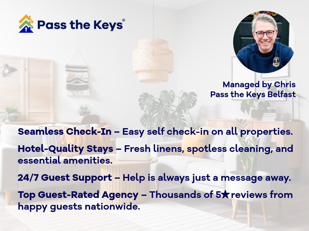 Hi, I'm Chris. I was born and raised on the north coast but like every other young person in Northern Ireland, was drawn to the bright lights of our capital city Belfast. After exhausting every fantastic nook and cranny this city has to offer I made my way around the world and throughout the next number of years found myself living and working in America, Japan, China and Korea. I returned home a few years ago to set up a home and raise my family in Holywood County Down. I took on the Pass the Keys Franchise in Belfast in 2019 and pandemic aside, the interest and uptake of our services have been incredible. My most valuable business trait is that I am honest and upfront - something that has served me well in building great relationships with my clients. I look forward to continuing to grow Pass the Keys in Belfast and offering more and more spectacular places for visitors to stay.