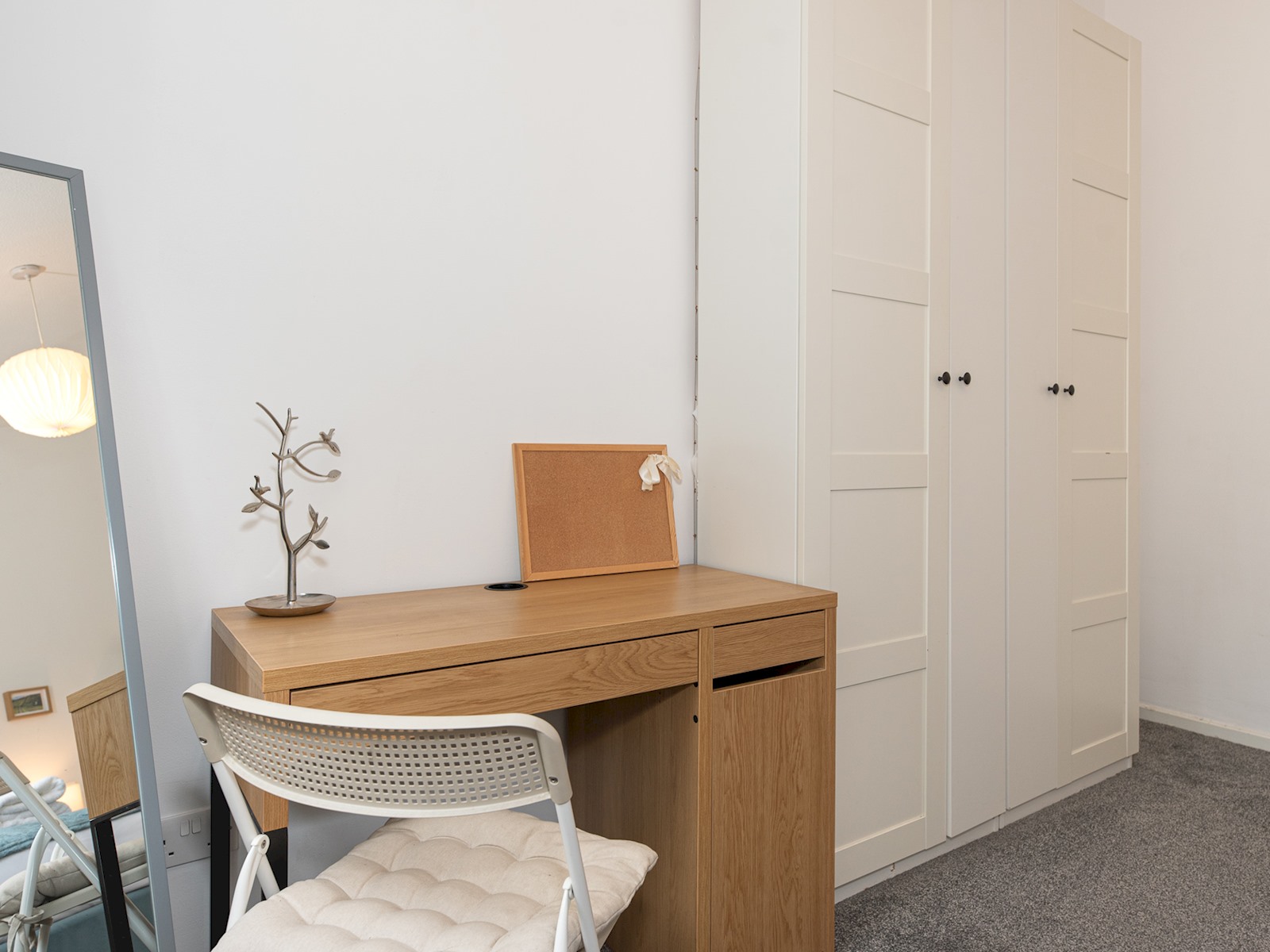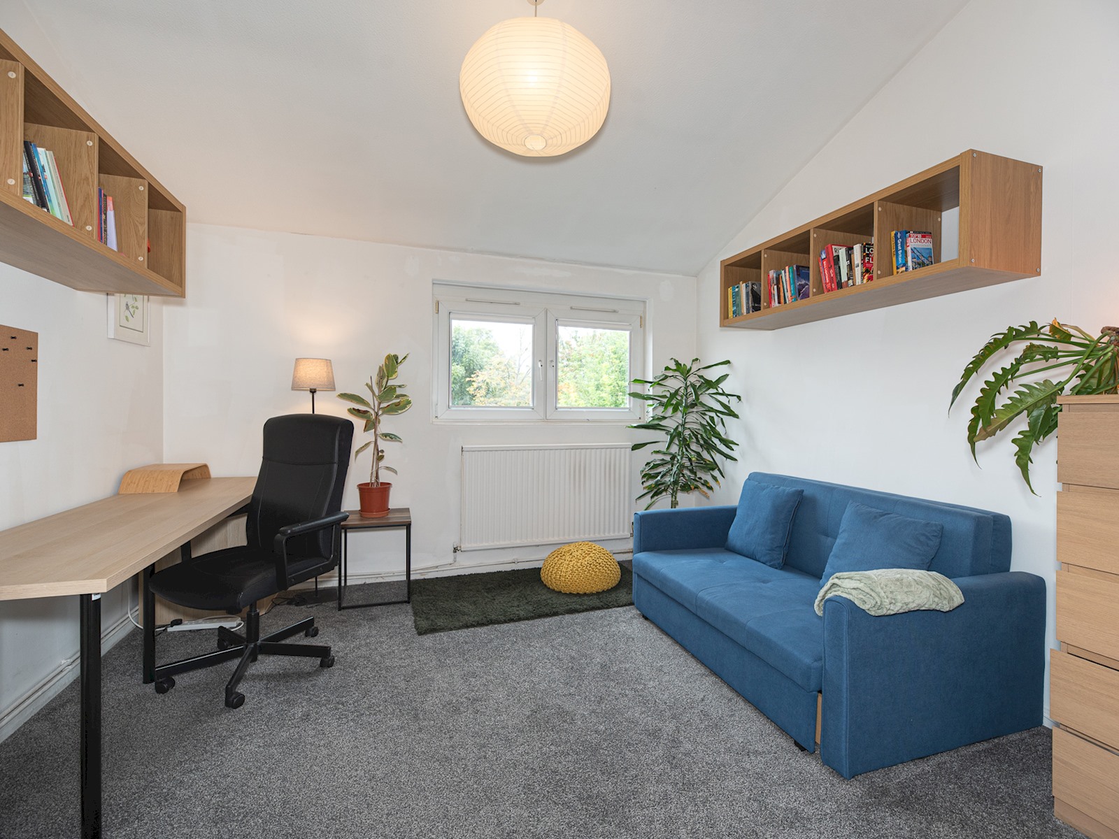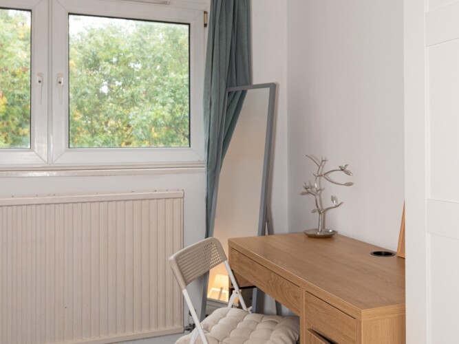 A second bedroom with a double sofa bed (perfect for one adult) and a large desk — ideal if you’re working remotely or need a quiet space to focus.