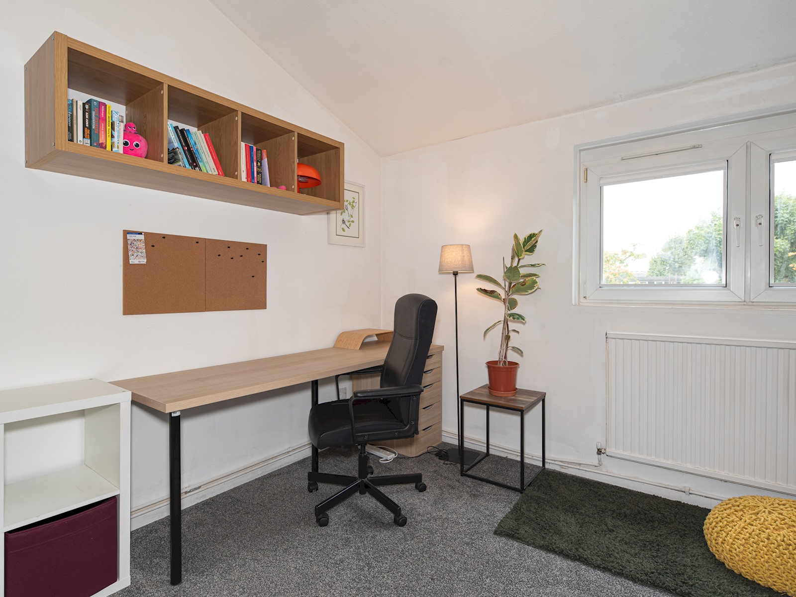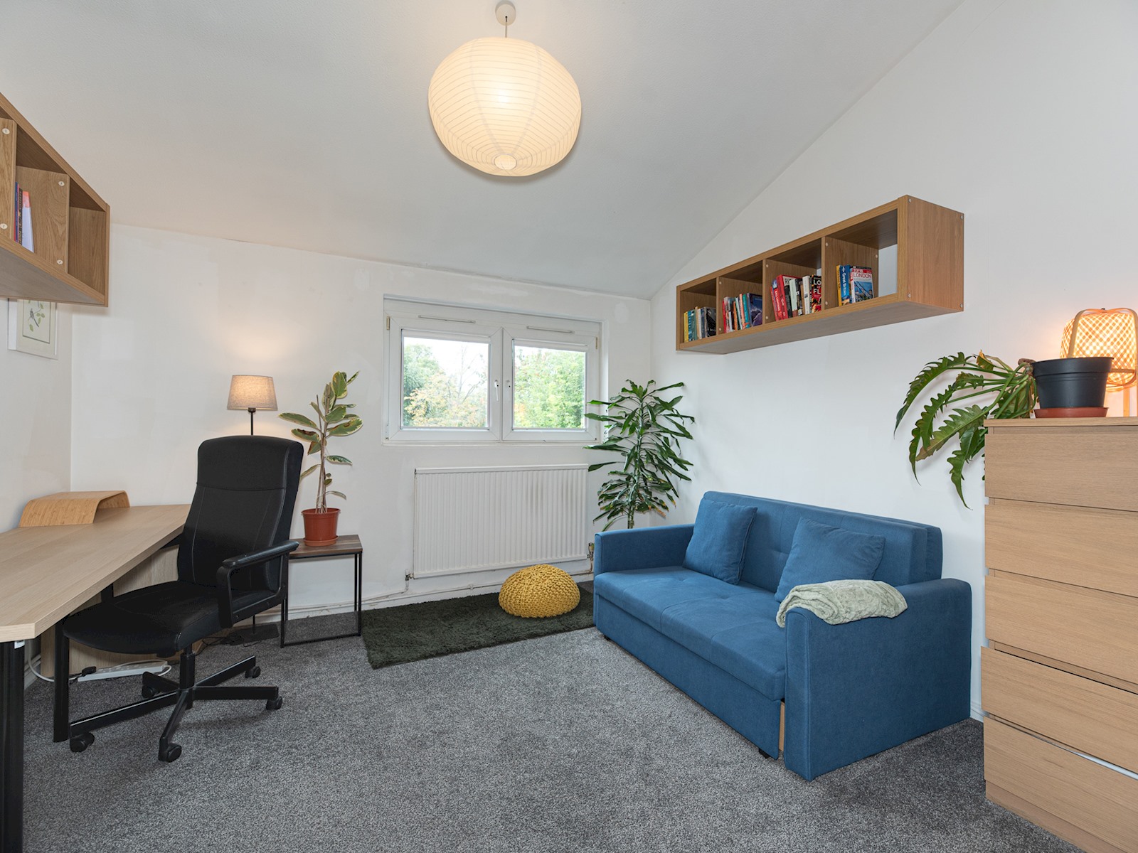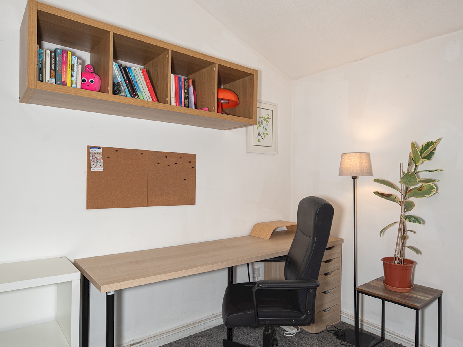 A second bedroom with a double sofa bed (perfect for one adult) and a large desk — ideal if you’re working remotely or need a quiet space to focus.