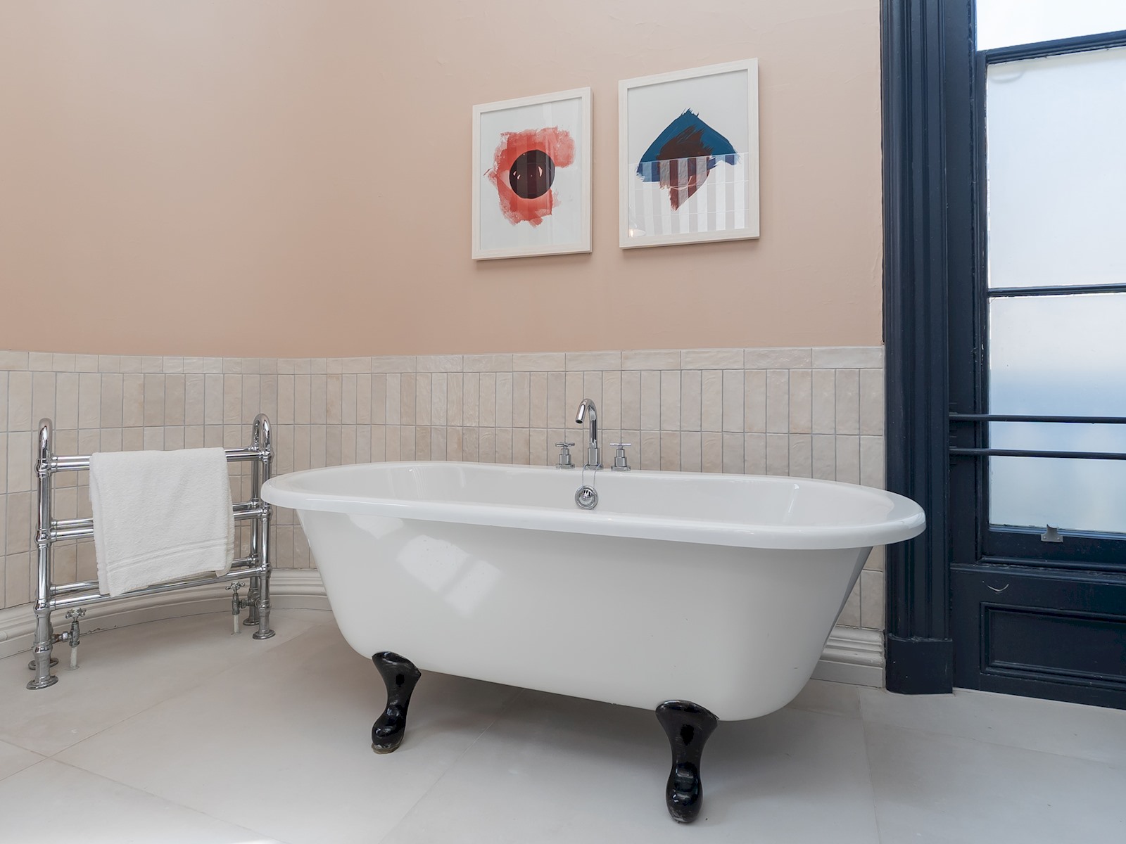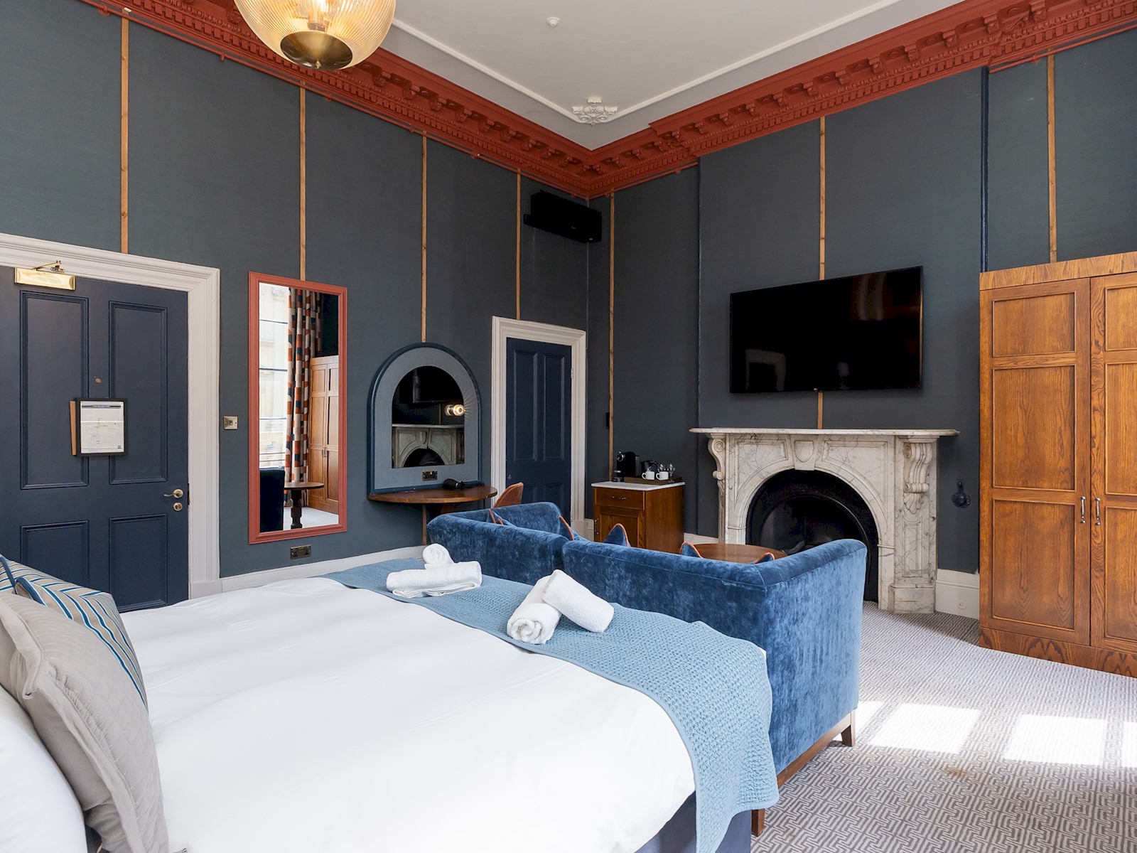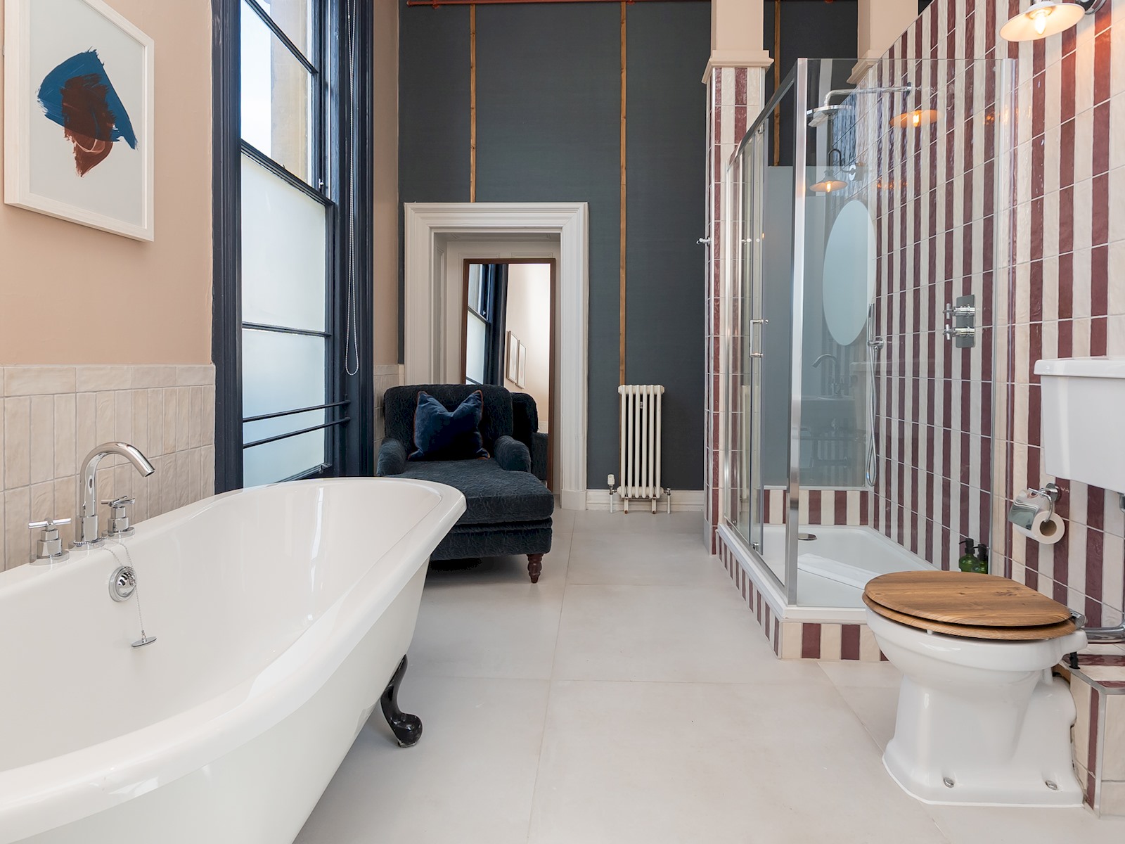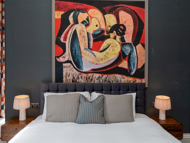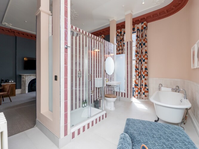 The room boosts high ceilings and large windows and has a comfortable super king size bed, and a luxurious large bathroom with roll top bath and a modern shower unit.